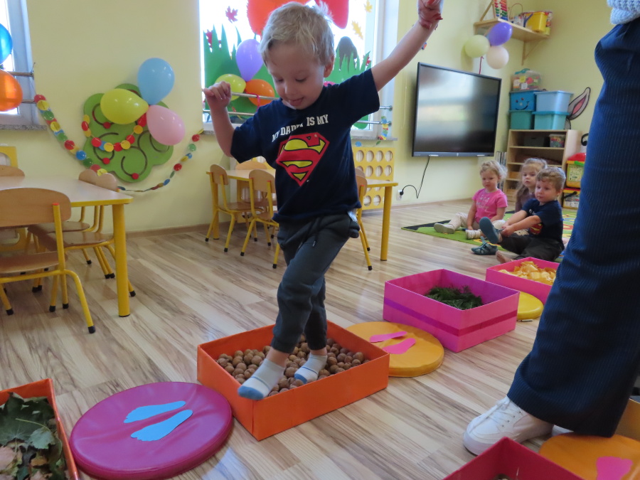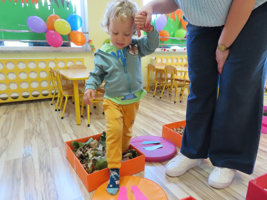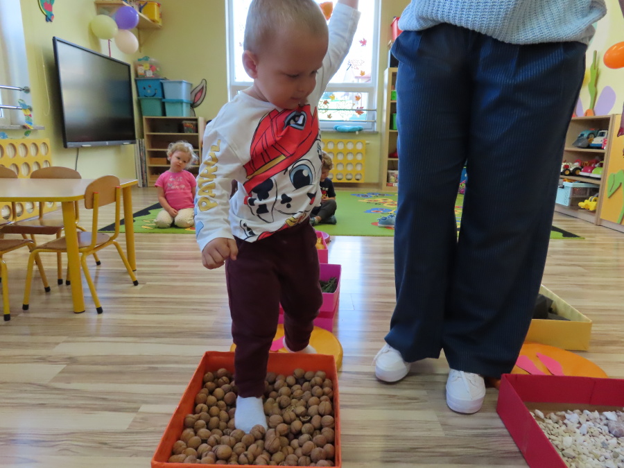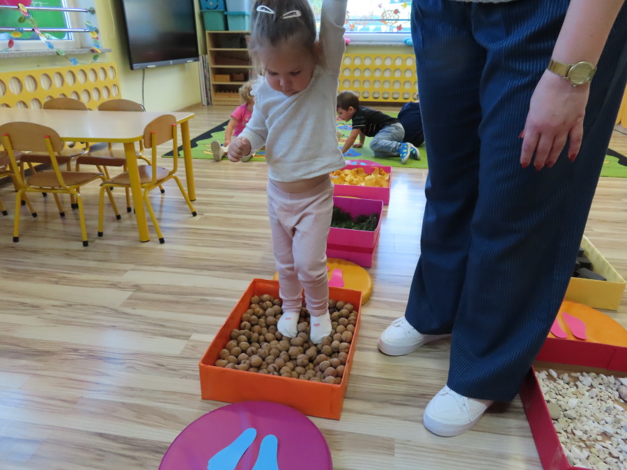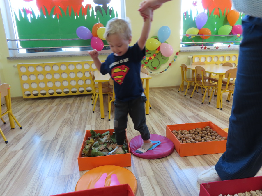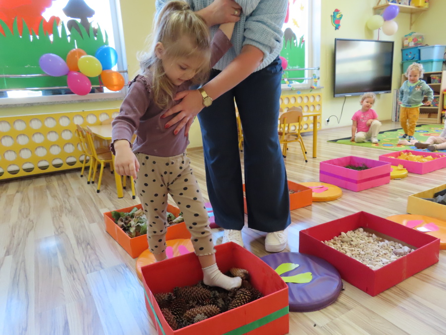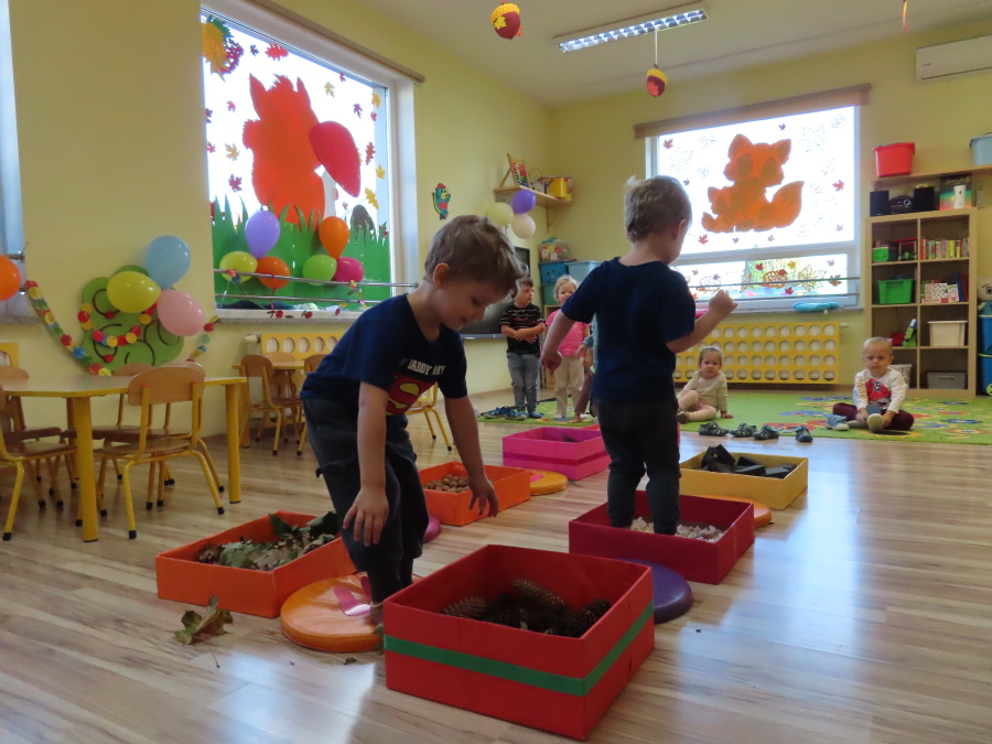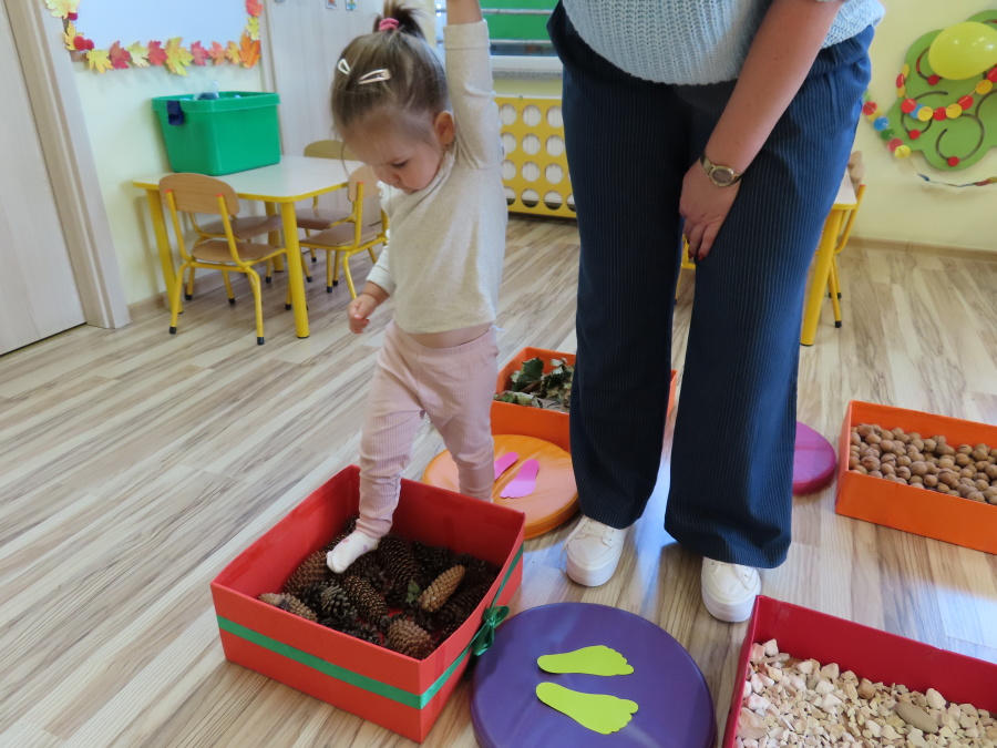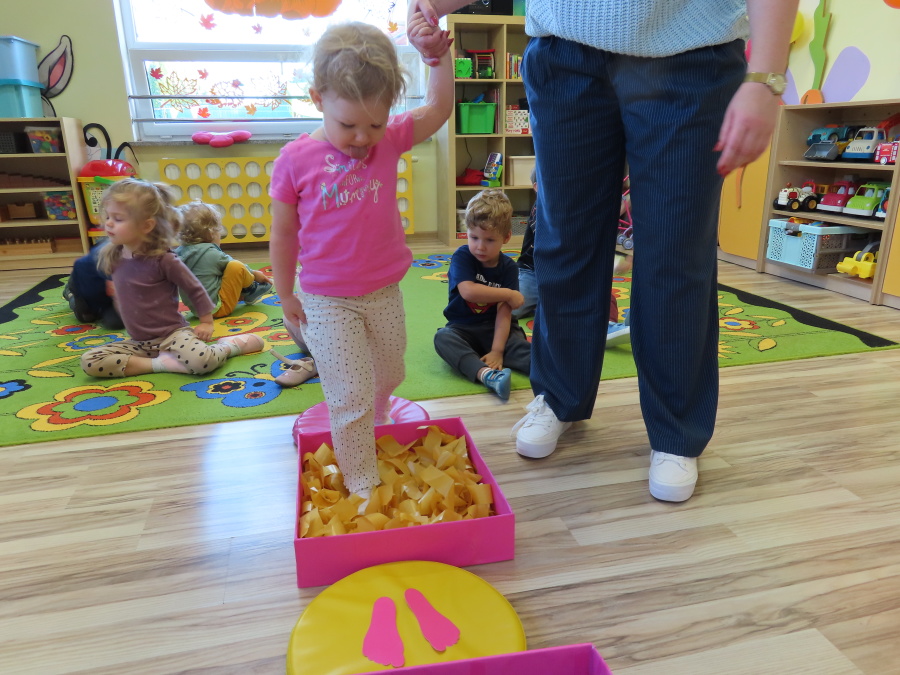 Zajęcia sensoryczne w Pszczółkach.???? Jesień dzisiaj przyszła do nas w postaci ścieżki sensorycznej. Wykorzystaliśmy szyszki, orzechy, liście, kamienie, a także przyjemne w dotyku pianki i szeleszczące papierki. ???????????????? Ścieżka sensoryczna ma ogromne znaczenie dla małych stópek, rozwija równowagę i koordynację ruchową. Usprawnia motorykę, rozwija wrażenia dotykowe, a co najważniejsze pozwala maluszkom rozwinąć wyobraźnię dotykową. ???????????? Ścieżka sensoryczna to również świetna zabawa i test na odwagę, który każda pszczółka zdała na medal.