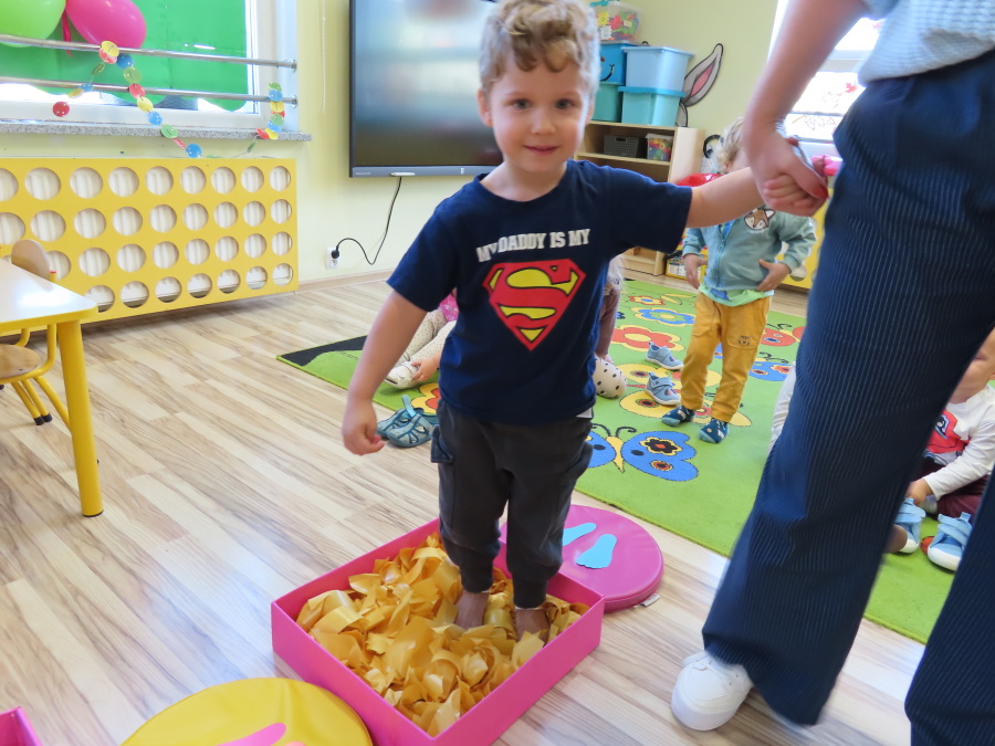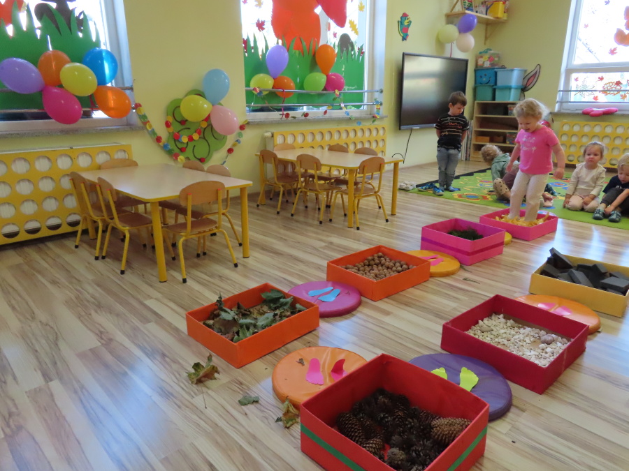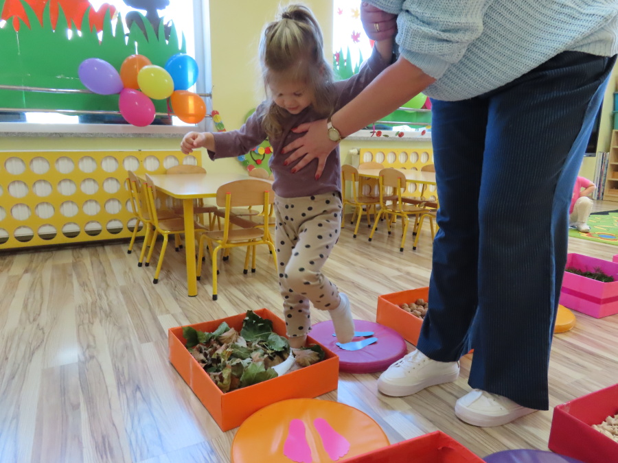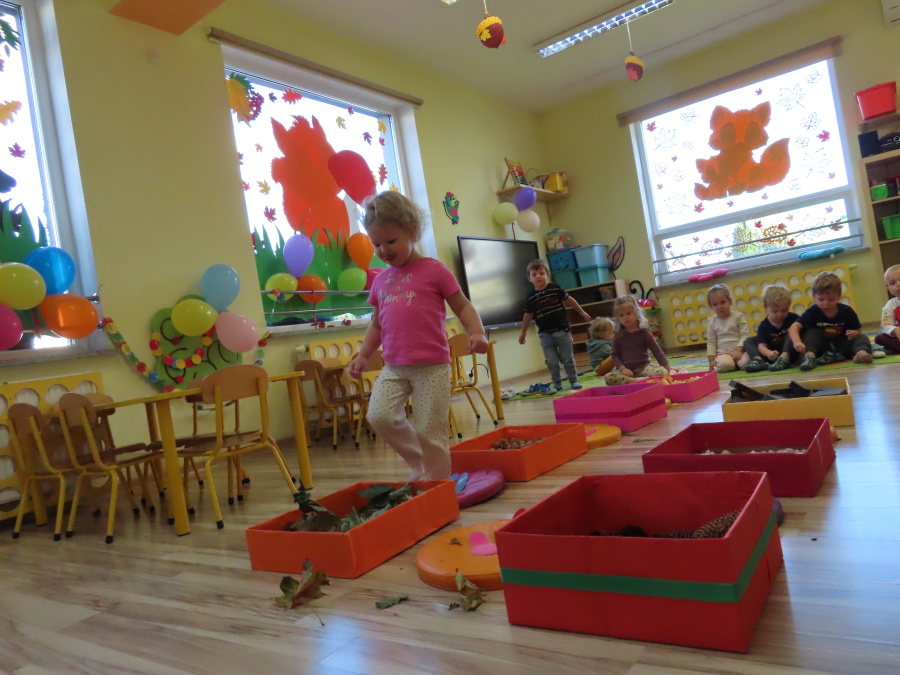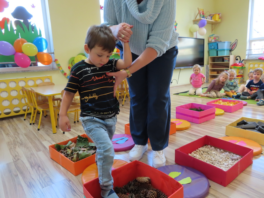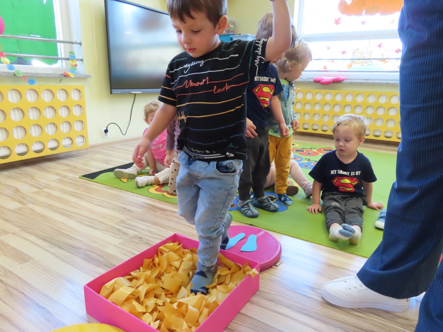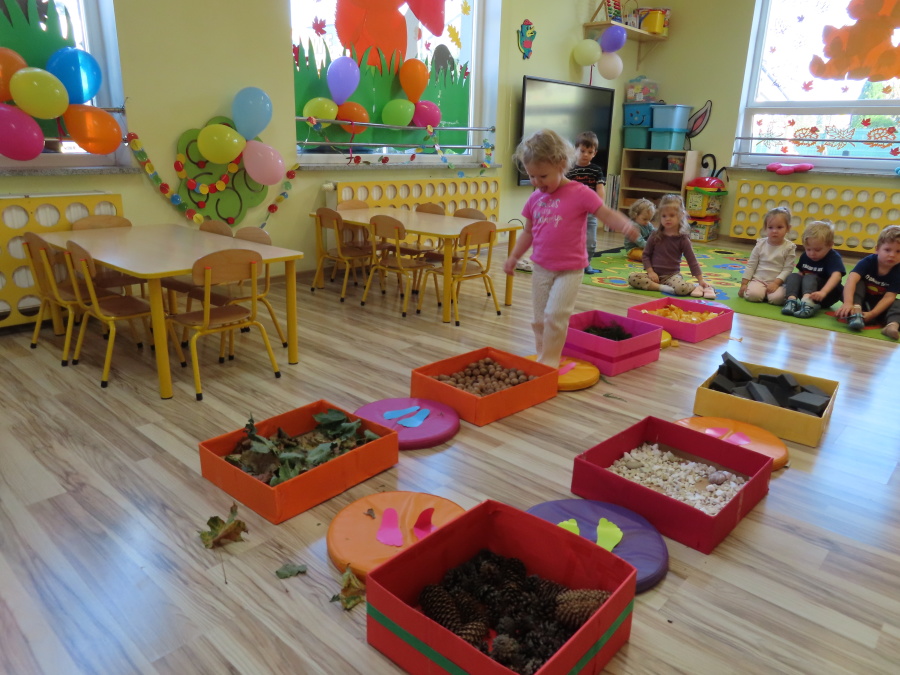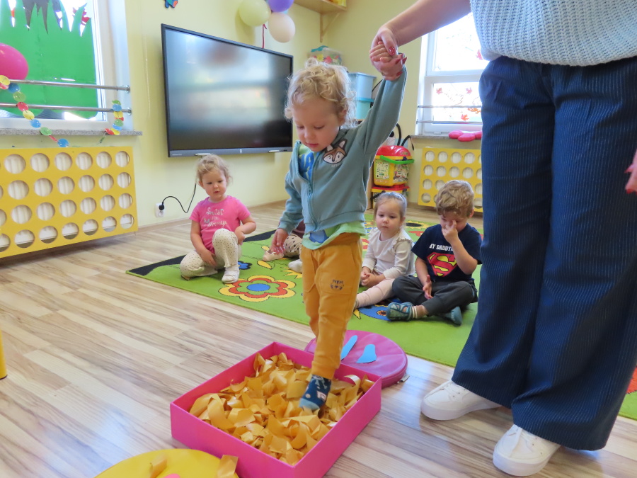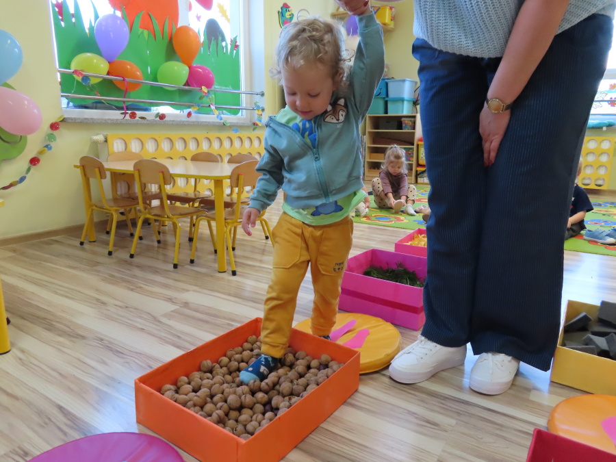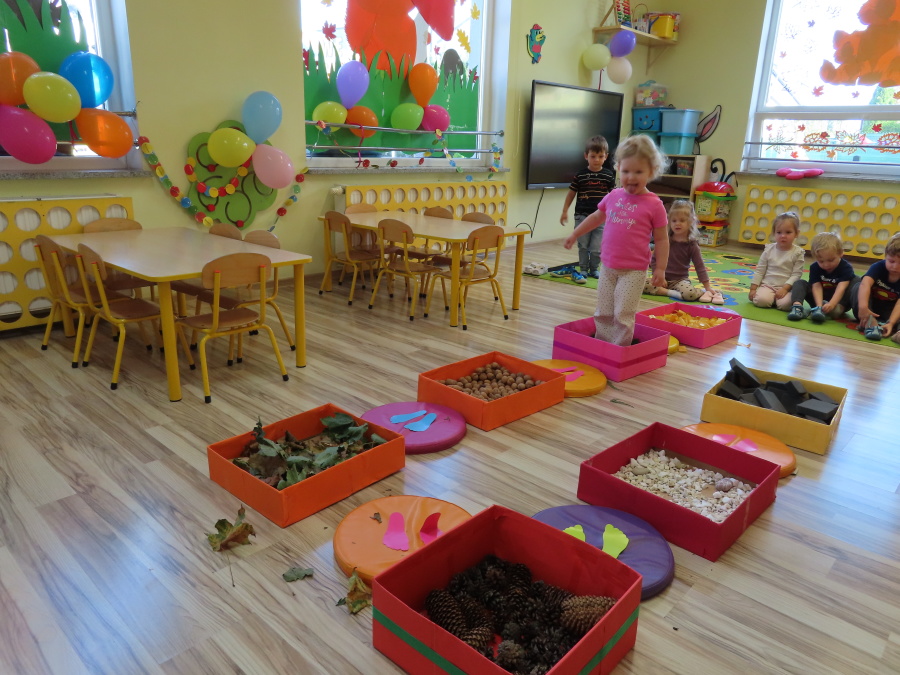 Zajęcia sensoryczne w Pszczółkach.???? Jesień dzisiaj przyszła do nas w postaci ścieżki sensorycznej. Wykorzystaliśmy szyszki, orzechy, liście, kamienie, a także przyjemne w dotyku pianki i szeleszczące papierki. ???????????????? Ścieżka sensoryczna ma ogromne znaczenie dla małych stópek, rozwija równowagę i koordynację ruchową. Usprawnia motorykę, rozwija wrażenia dotykowe, a co najważniejsze pozwala maluszkom rozwinąć wyobraźnię dotykową. ???????????? Ścieżka sensoryczna to również świetna zabawa i test na odwagę, który każda pszczółka zdała na medal.