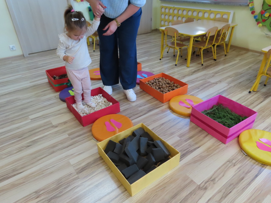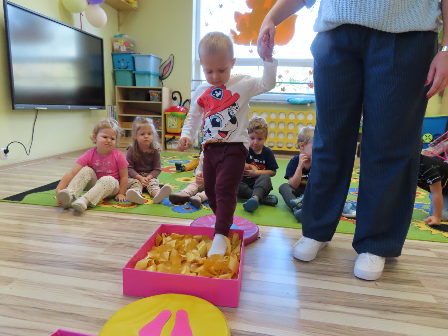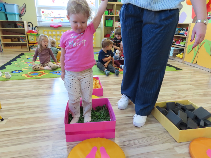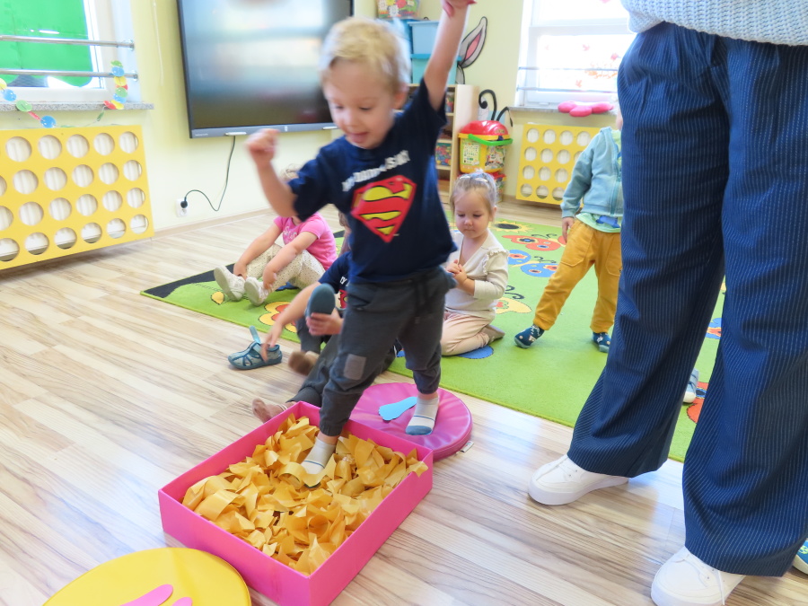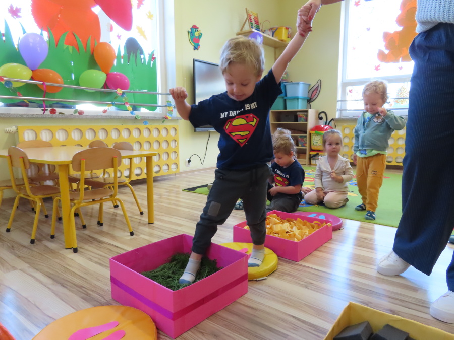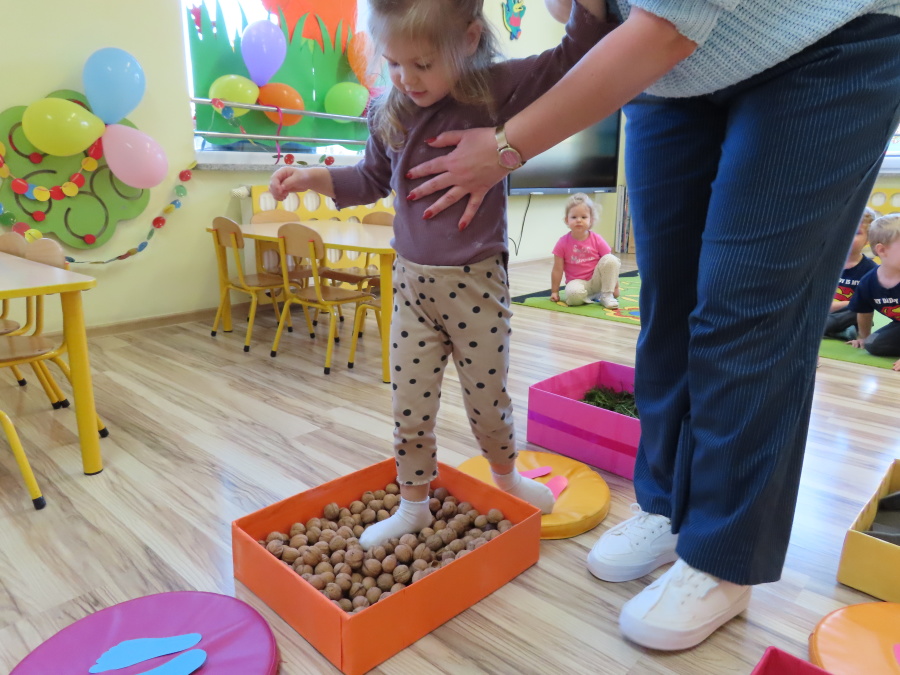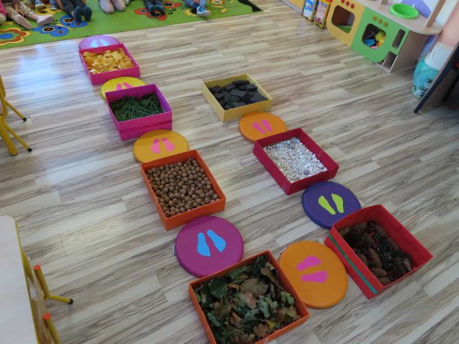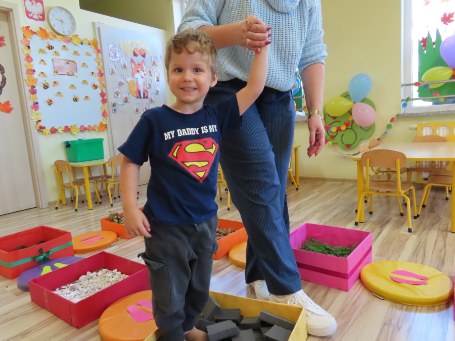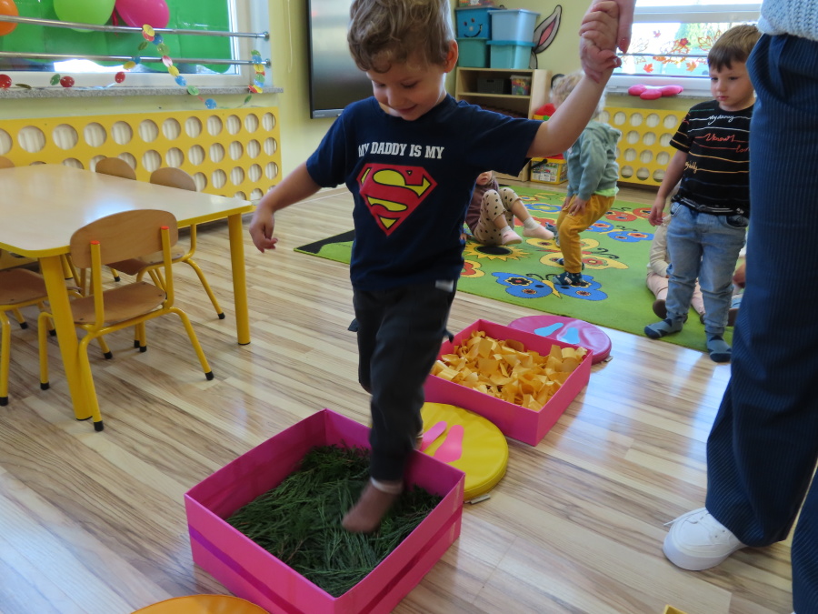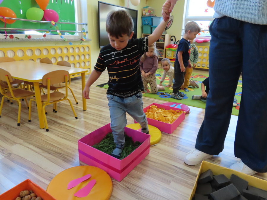 Zajęcia sensoryczne w Pszczółkach.???? Jesień dzisiaj przyszła do nas w postaci ścieżki sensorycznej. Wykorzystaliśmy szyszki, orzechy, liście, kamienie, a także przyjemne w dotyku pianki i szeleszczące papierki. ???????????????? Ścieżka sensoryczna ma ogromne znaczenie dla małych stópek, rozwija równowagę i koordynację ruchową. Usprawnia motorykę, rozwija wrażenia dotykowe, a co najważniejsze pozwala maluszkom rozwinąć wyobraźnię dotykową. ???????????? Ścieżka sensoryczna to również świetna zabawa i test na odwagę, który każda pszczółka zdała na medal.