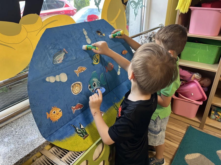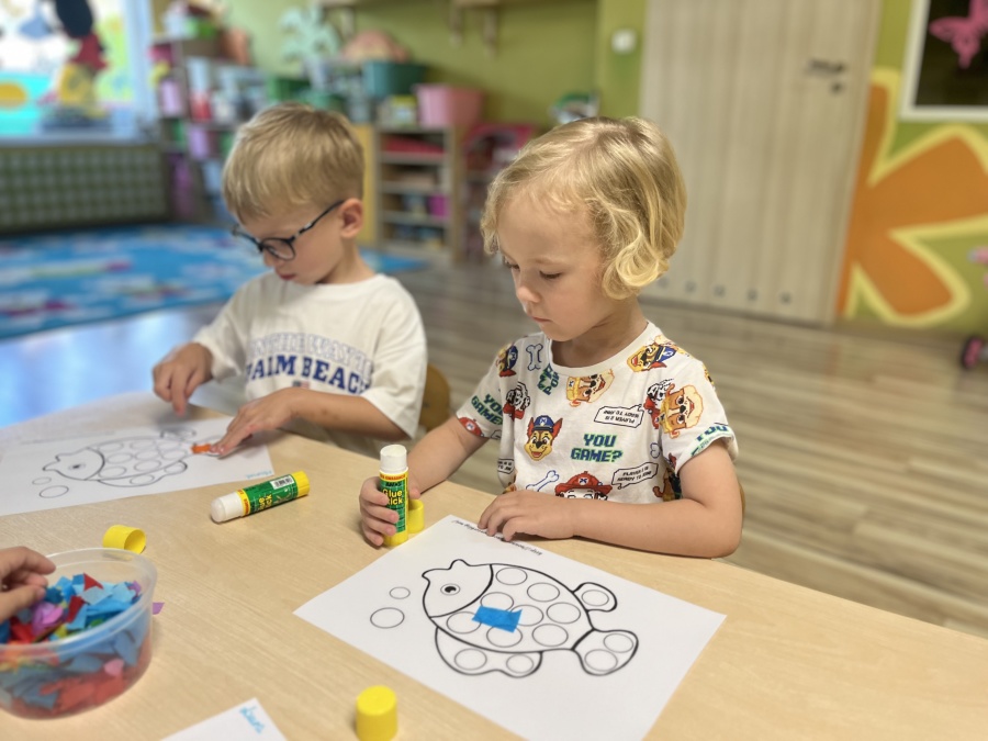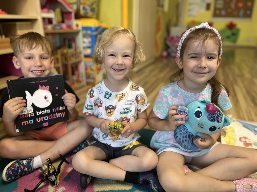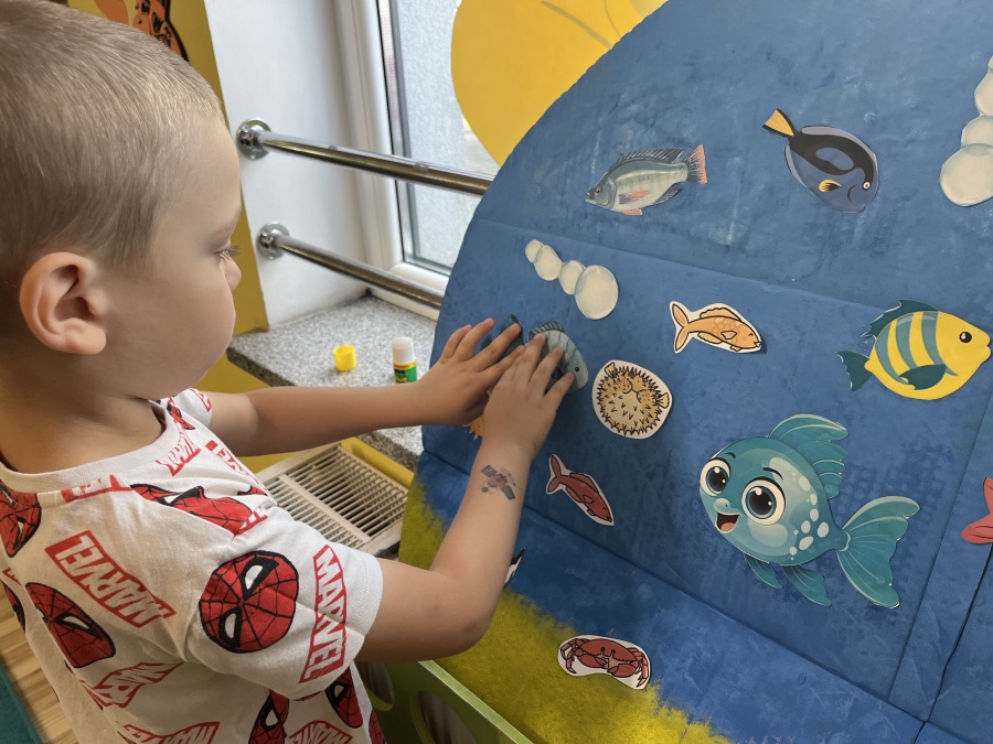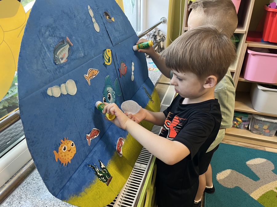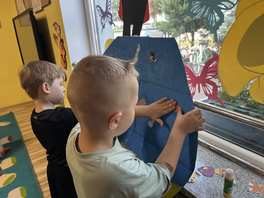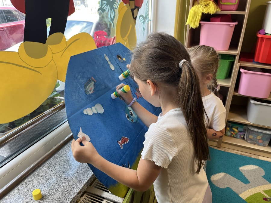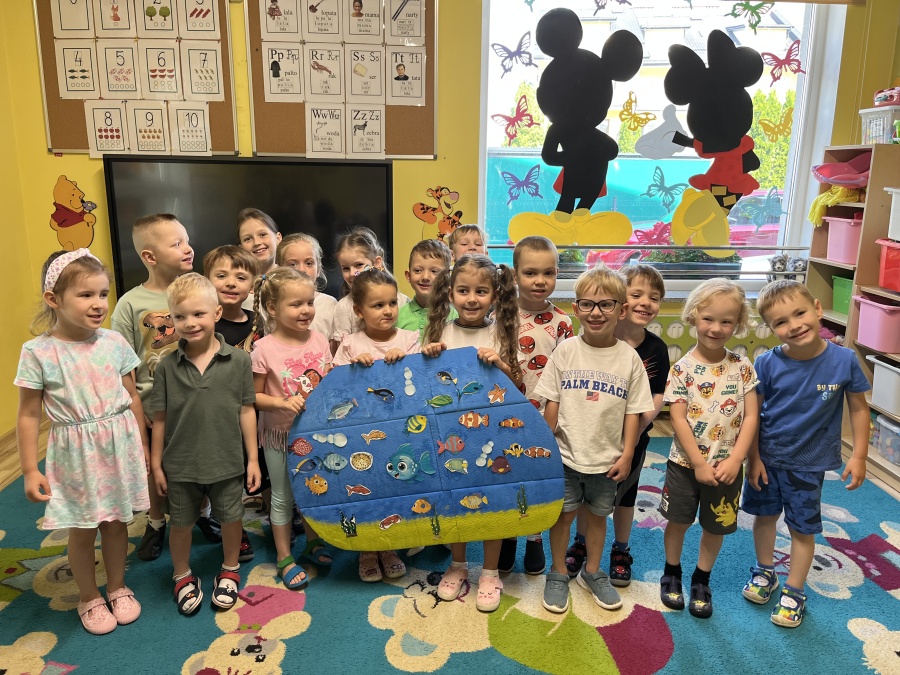 W ramach Dnia Ryby Tygryski obejrzały krótki film edukacyjny o życiu pod wodą, wykleiły bibułą kolorowe rybki oraz wspólnie wykonały akwarium. Przyniosły też z domu gadżety związane z rybami, którymi chętnie się dzieliły. Dzień upłynął w radosnej i twórczej atmosferze.