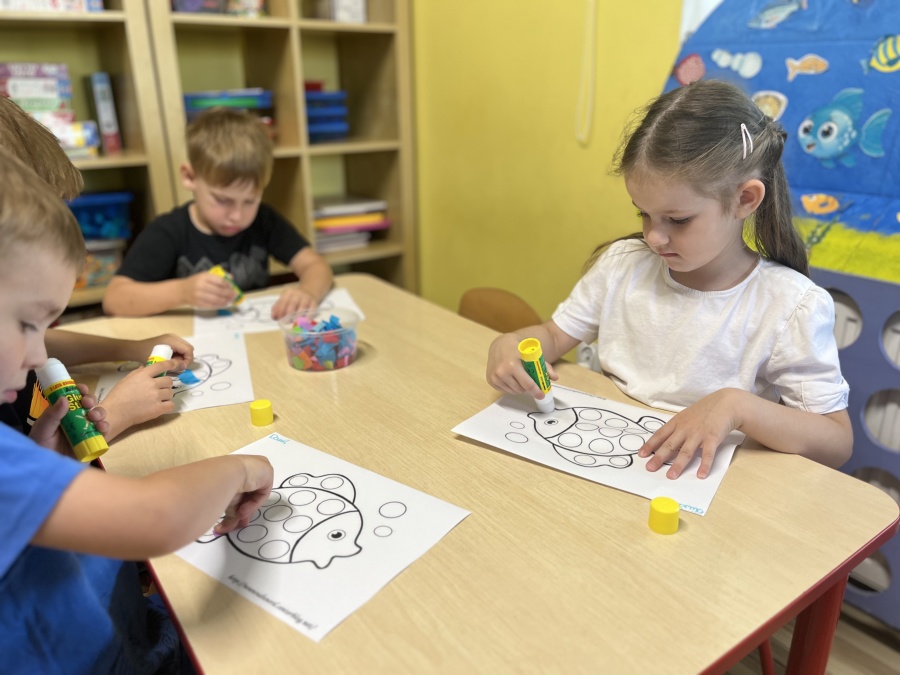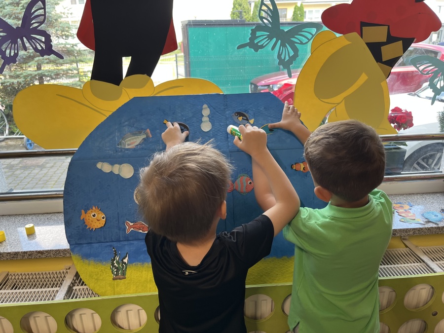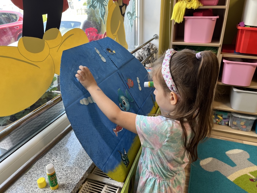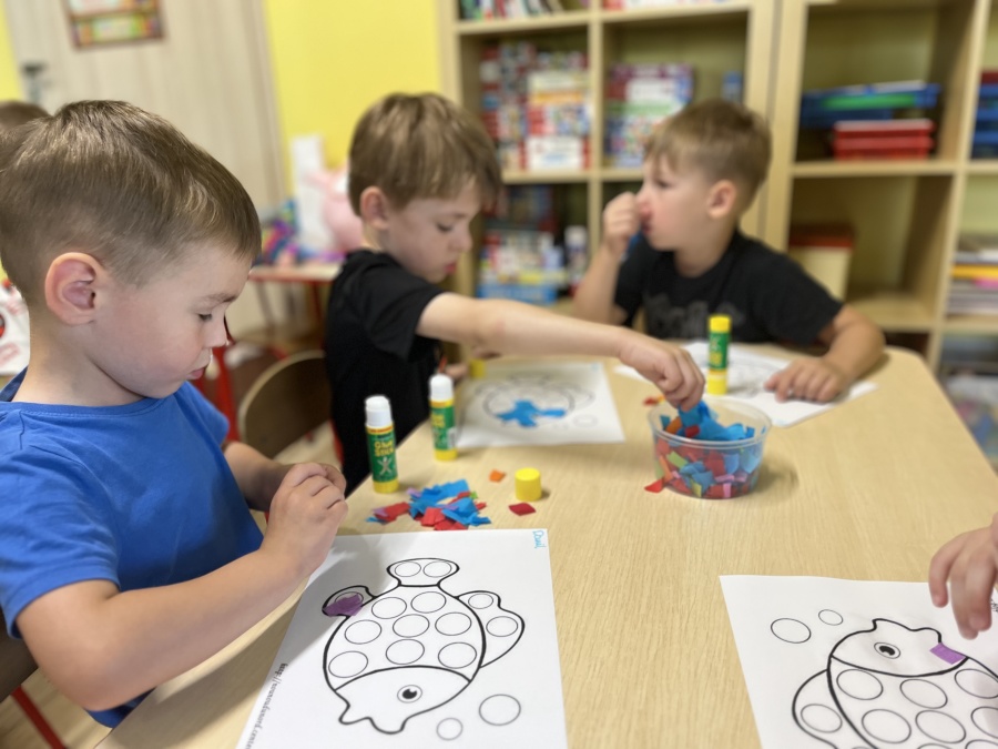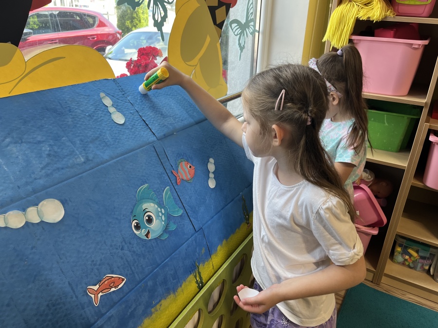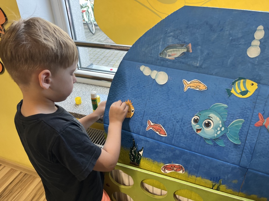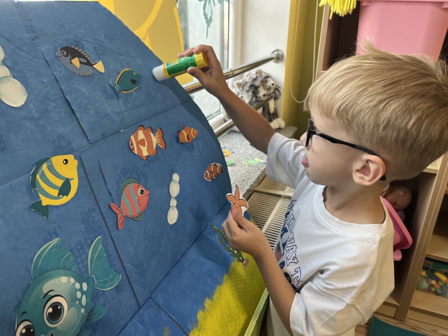 W ramach Dnia Ryby Tygryski obejrzały krótki film edukacyjny o życiu pod wodą, wykleiły bibułą kolorowe rybki oraz wspólnie wykonały akwarium. Przyniosły też z domu gadżety związane z rybami, którymi chętnie się dzieliły. Dzień upłynął w radosnej i twórczej atmosferze.