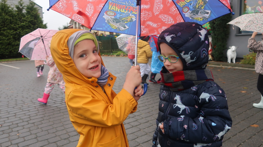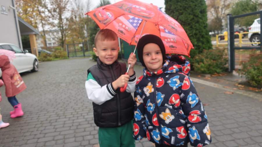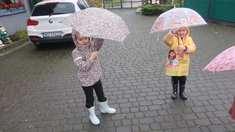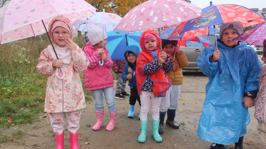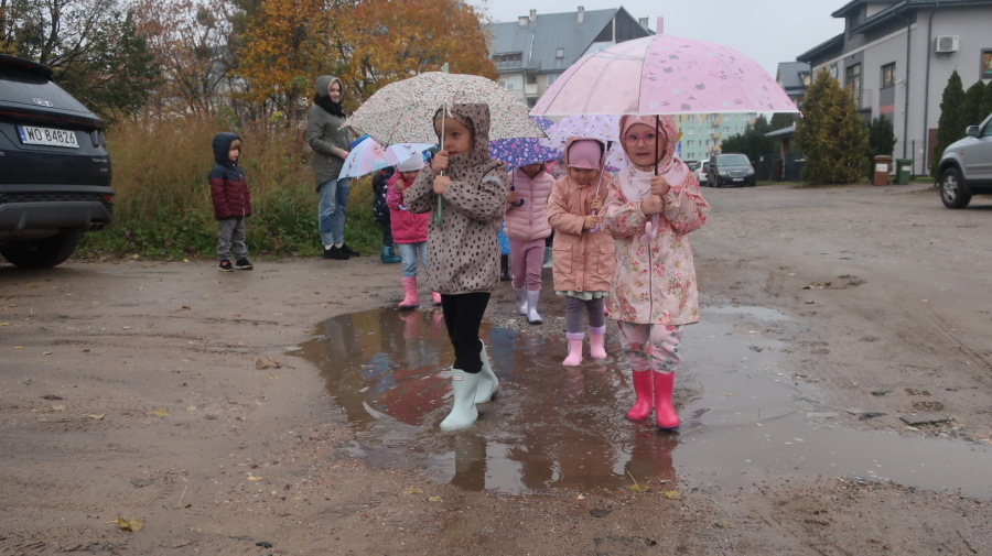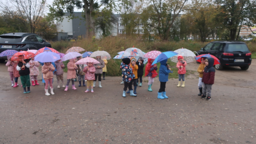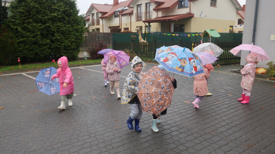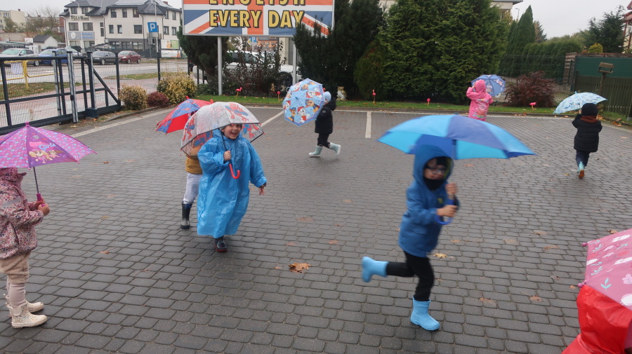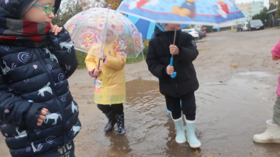 Dziś w grupie Tygrysków odbył się wyjątkowy dzień pod hasłem „Skaczemy po kałużach”. Dzieci przyszły do przedszkola wyposażone w kalosze, kolorowe parasole i płaszcze przeciwdeszczowe, gotowe na wspólną zabawę na świeżym powietrzu. Po krótkich przygotowaniach wszyscy wyruszyliśmy na jesienny spacer, podczas którego podziwialiśmy barwne liście i z radością skakaliśmy w kałużach. Dzieci miały mnóstwo frajdy, śmiechu i ruchu na świeżym powietrzu, a ten deszczowy dzień okazał się pełen ciepła i wspaniałych wspomnień.