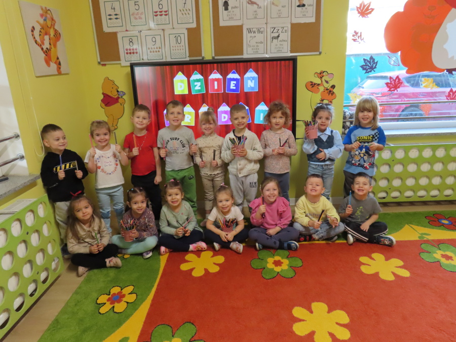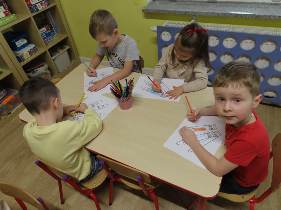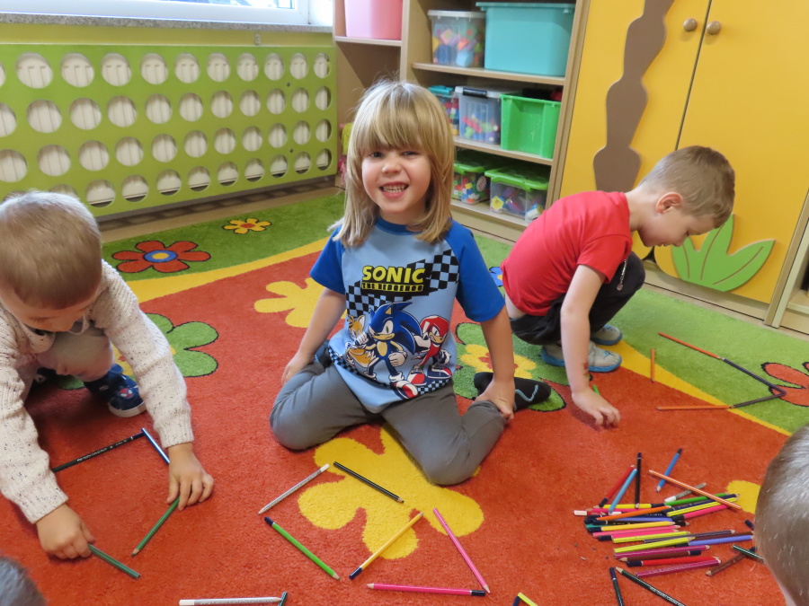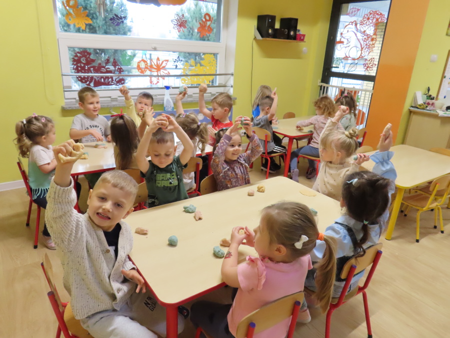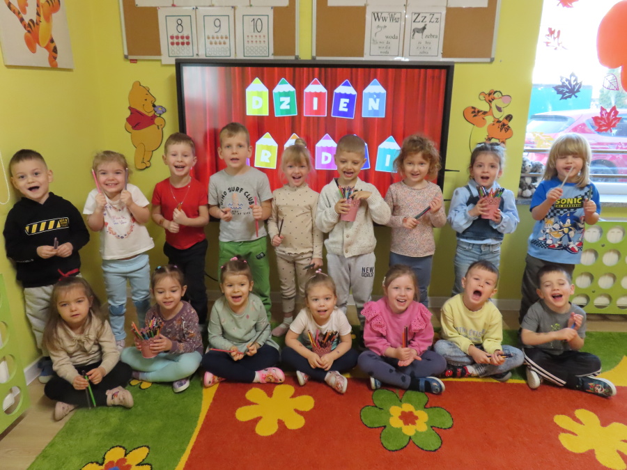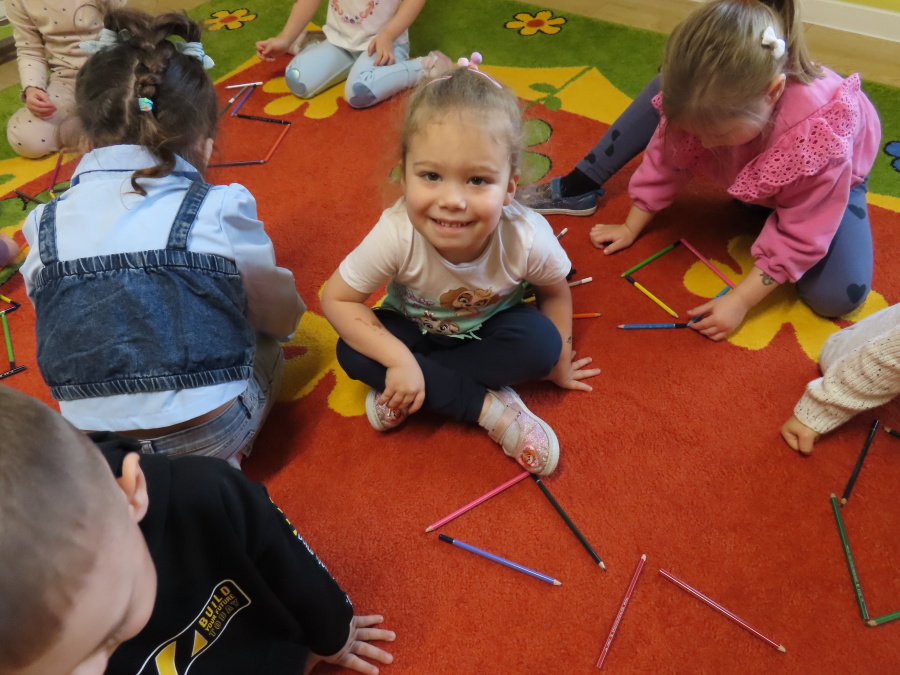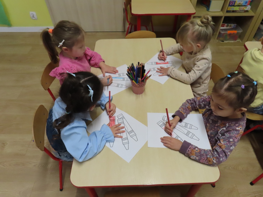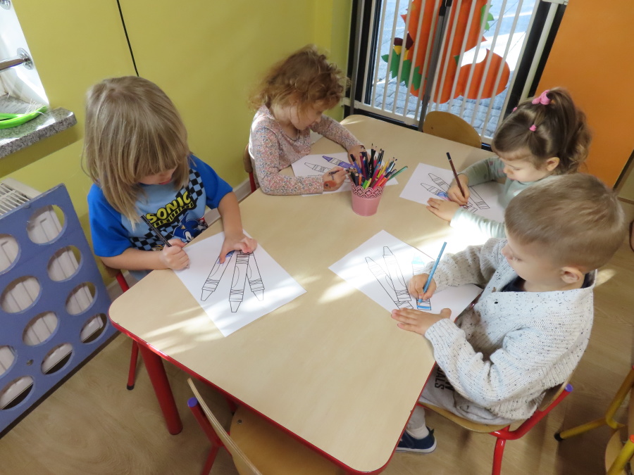 W grupie Tygrysków obchodziliśmy dziś Dzień Kredki, pełen barw i twórczej zabawy. Dzieci dowiedziały się, jak wytwarzane są kredki, a następnie z zaangażowaniem rozwiązywały zadania na tablicy multimedialnej. Na dywanie układały różne figury z kolorowych kredek, rozwijając przy tym wyobraźnię i sprawność manualną. Nie zabrakło także kolorowania – każdy uczestnik ozdabiał obrazek przedstawiający kredki, dobierając barwy według własnego pomysłu. W ramach zajęć sensorycznych przedszkolaki wspólnie przygotowały masę plastyczną, wykorzystując starte na tarce kredki świecowe jako naturalne barwniki, a następnie lepiły z niej małe figurki i kształty, ćwicząc zręczność i kreatywność