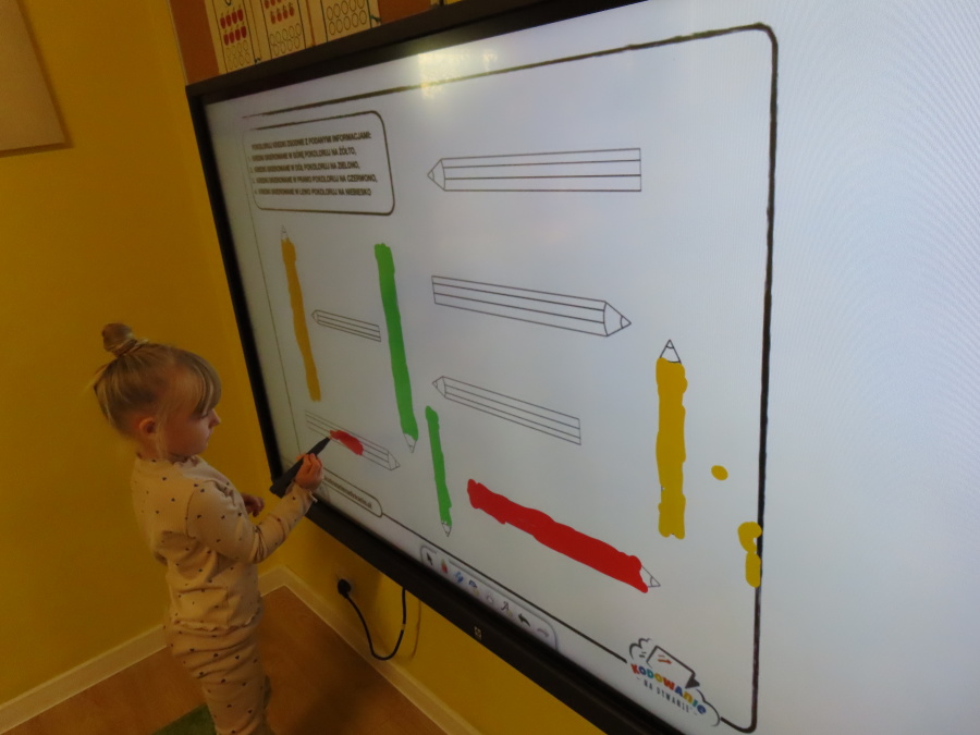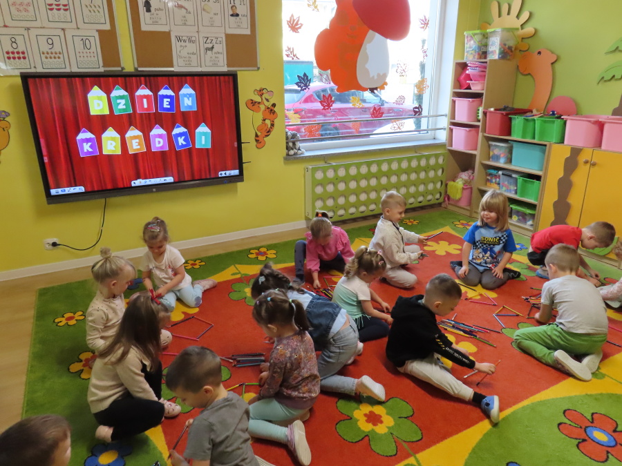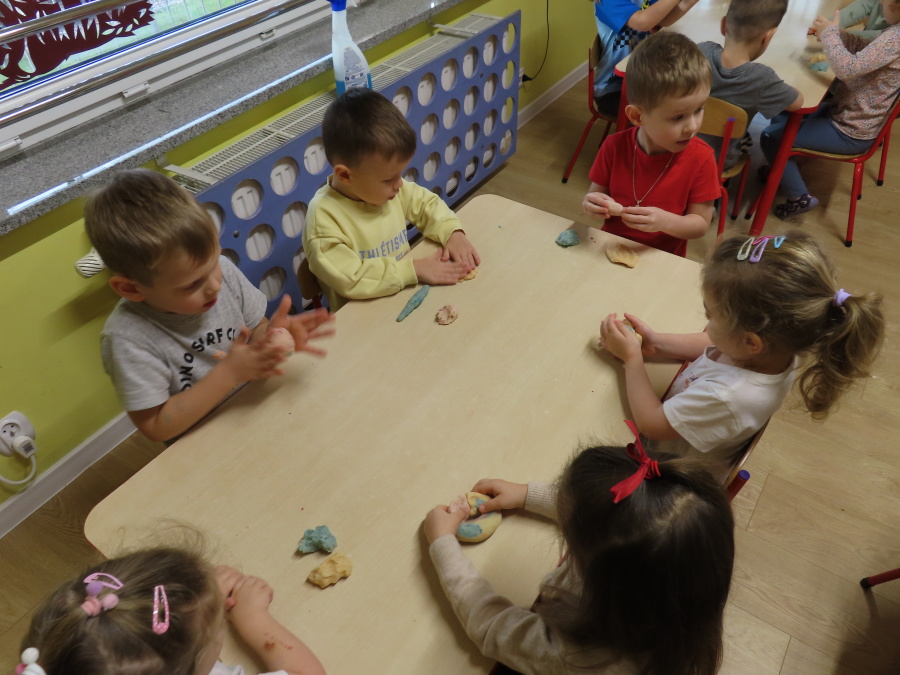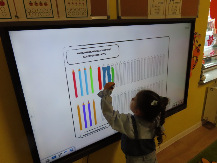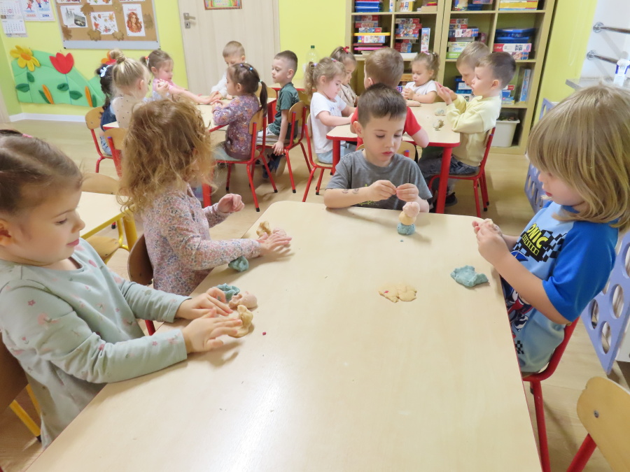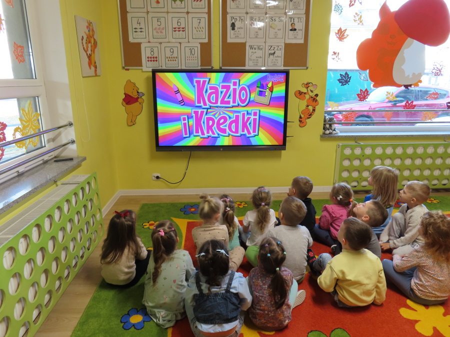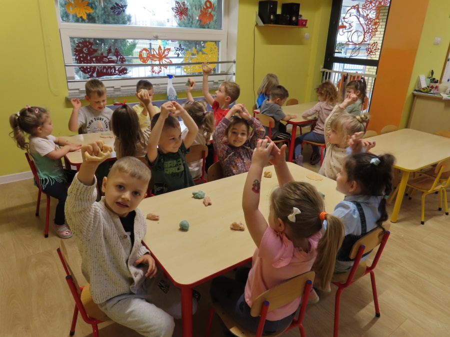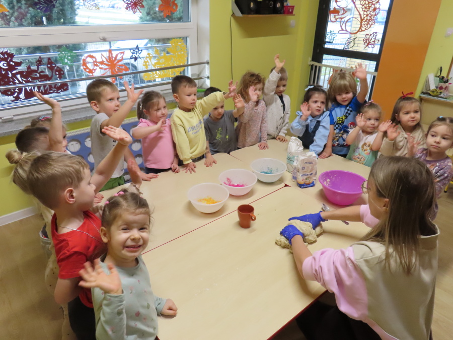 W grupie Tygrysków obchodziliśmy dziś Dzień Kredki, pełen barw i twórczej zabawy. Dzieci dowiedziały się, jak wytwarzane są kredki, a następnie z zaangażowaniem rozwiązywały zadania na tablicy multimedialnej. Na dywanie układały różne figury z kolorowych kredek, rozwijając przy tym wyobraźnię i sprawność manualną. Nie zabrakło także kolorowania – każdy uczestnik ozdabiał obrazek przedstawiający kredki, dobierając barwy według własnego pomysłu. W ramach zajęć sensorycznych przedszkolaki wspólnie przygotowały masę plastyczną, wykorzystując starte na tarce kredki świecowe jako naturalne barwniki, a następnie lepiły z niej małe figurki i kształty, ćwicząc zręczność i kreatywność
