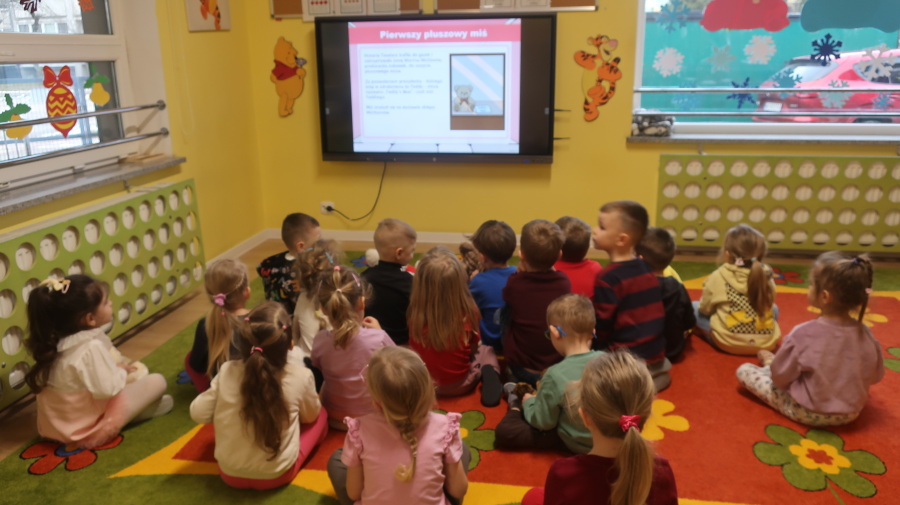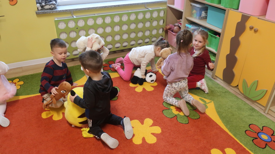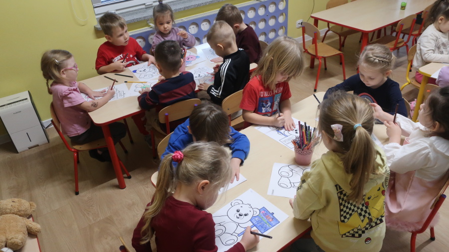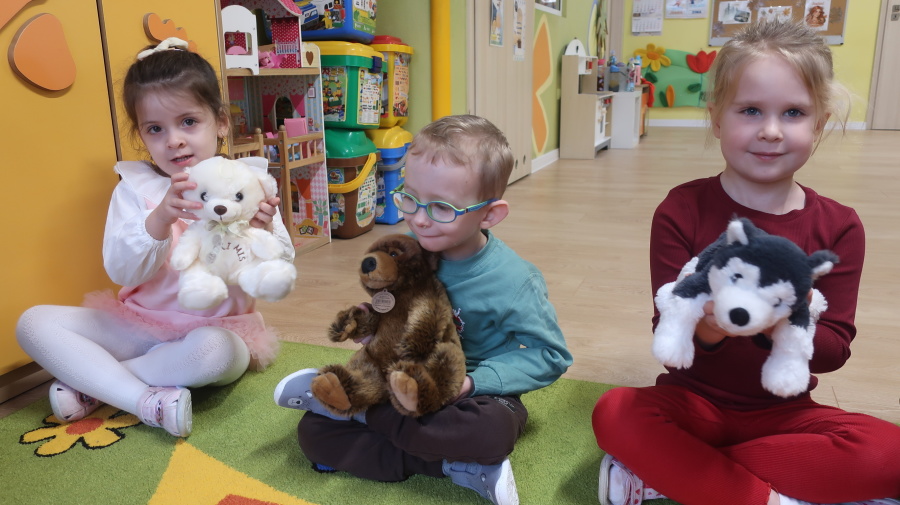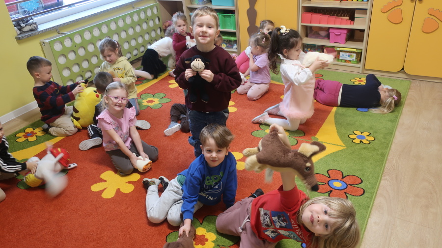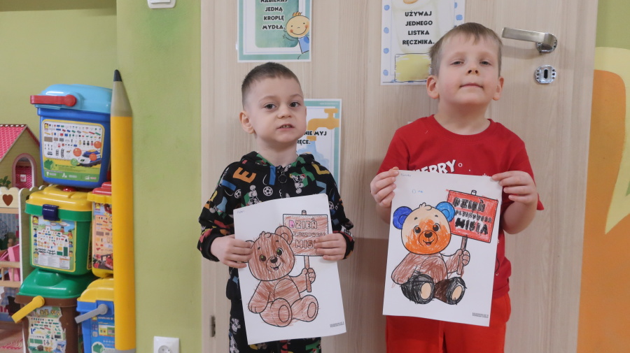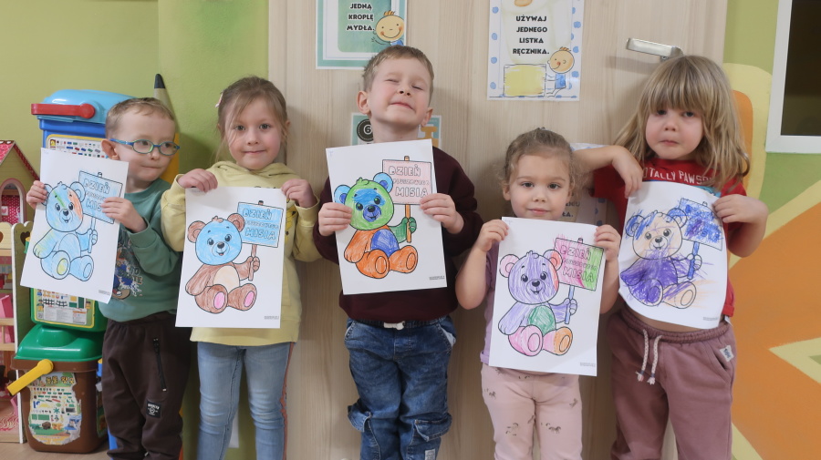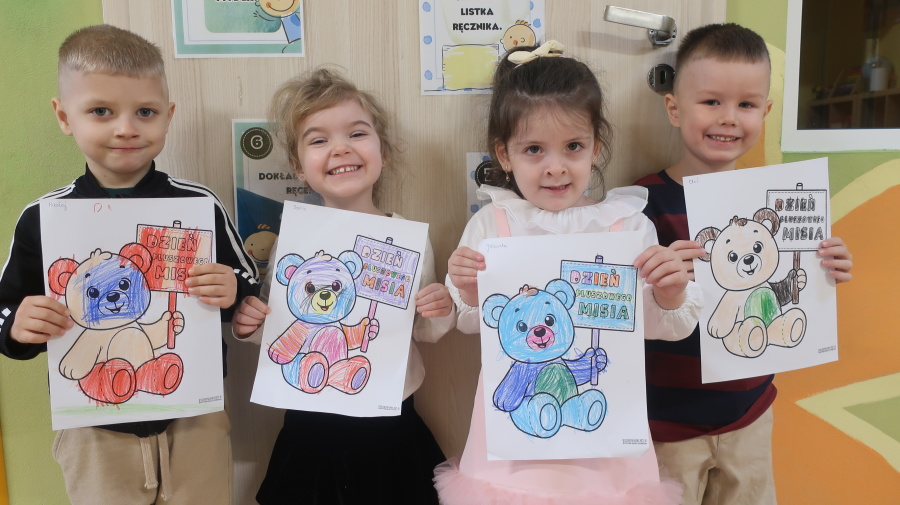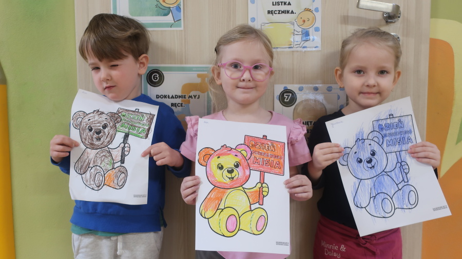 Dziś w naszej grupie świętowaliśmy Dzień Pluszowego Misia. Z tej okazji dzieci przyniosły swoje ulubione pluszaki, które na początku zajęć wzajemnie sobie przedstawiały, opowiadając o nich i bawiąc się wspólnie. Następnie obejrzeliśmy prezentację pokazującą, jak powstały pluszowe misie oraz wykonaliśmy kilka ciekawych zadań związanych z misiami. Kolejnym punktem zajęć było układanie misiów z klocków, co sprawiło dzieciom dużo radości i pozwoliło rozwijać ich kreatywność. Po zabawie wykonaliśmy pracę plastyczną polegającą na kolorowaniu obrazków, a na zakończenie dzieci miały czas na swobodną zabawę ze swoimi pluszakami.