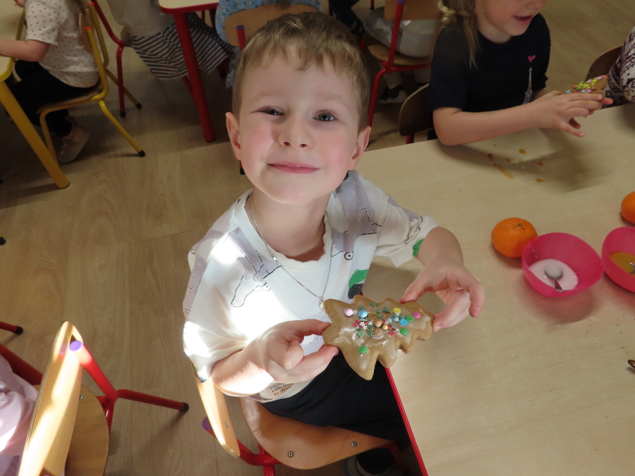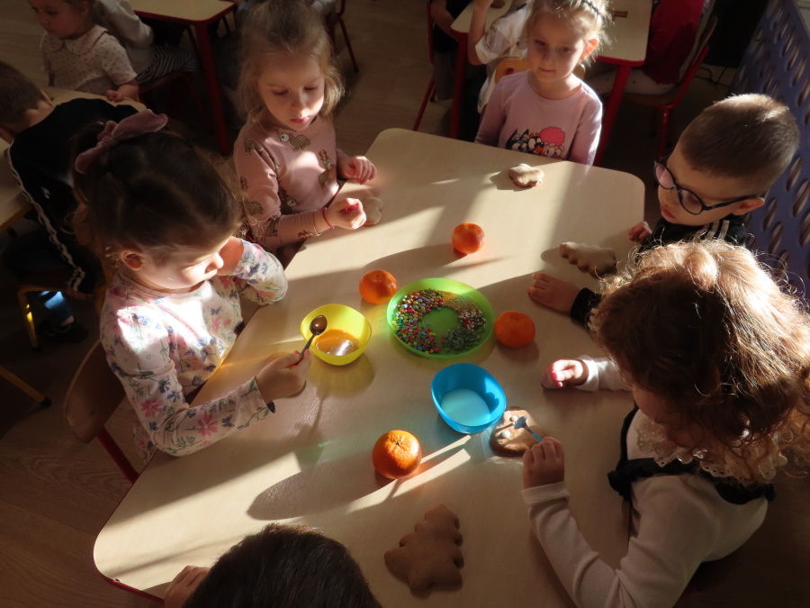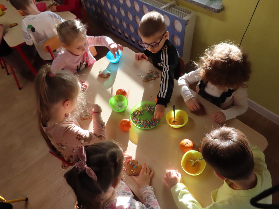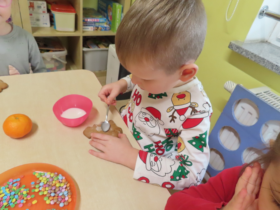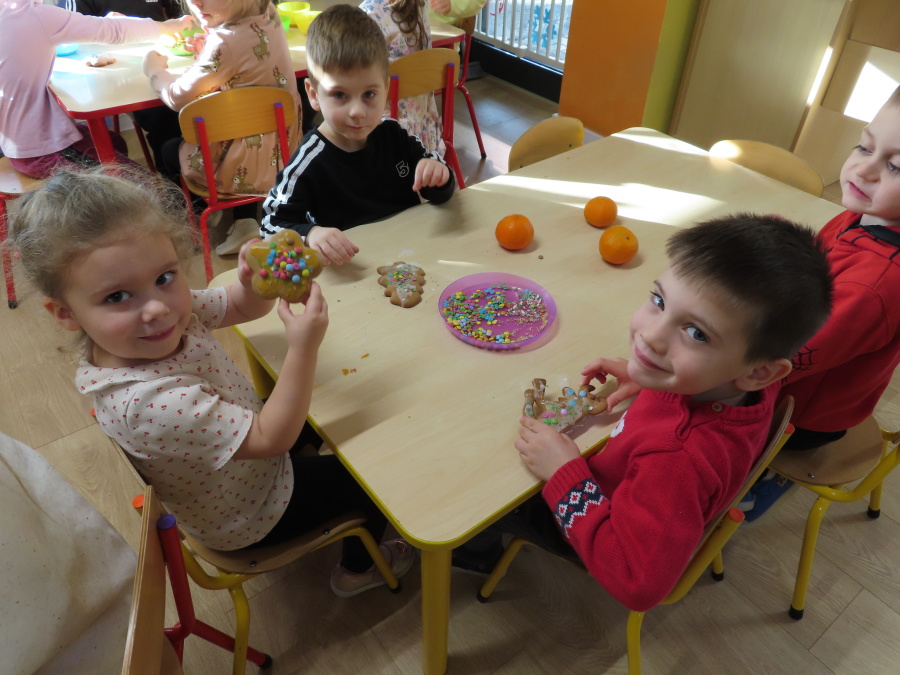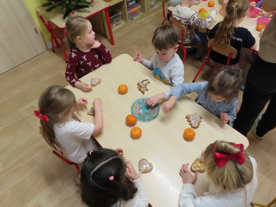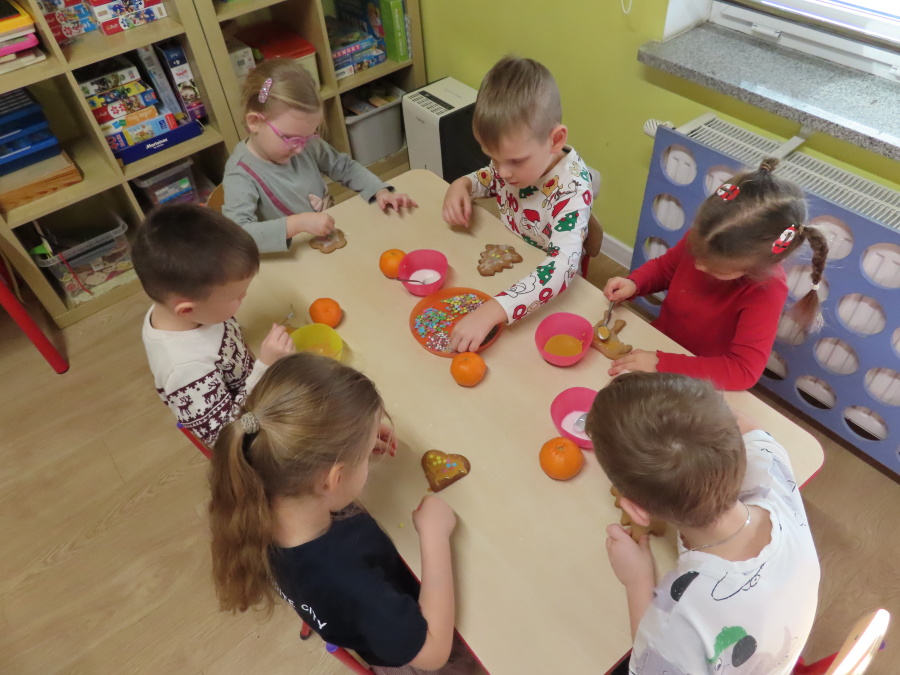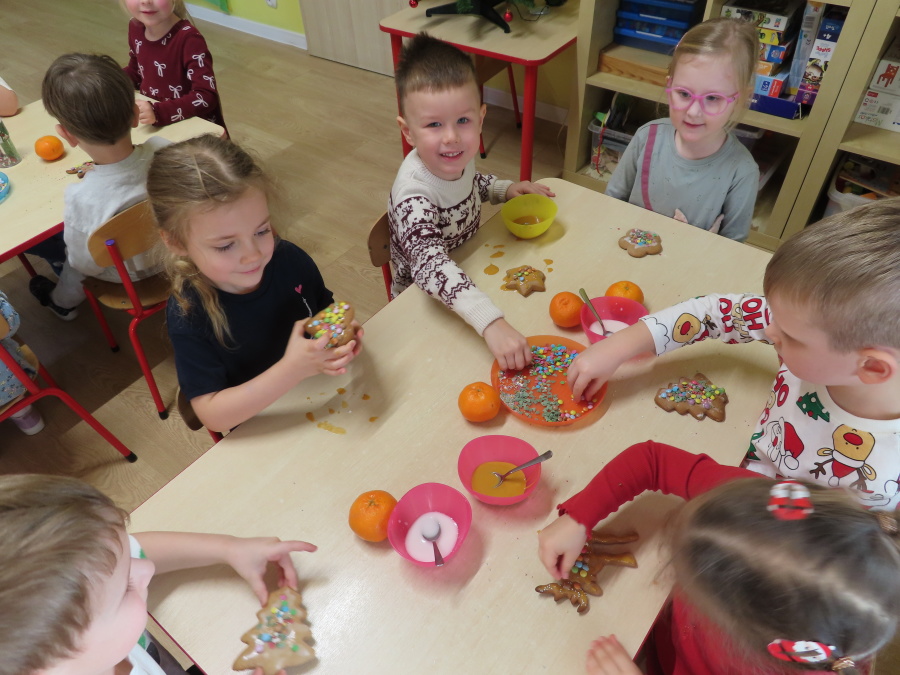 Dziś w naszej grupie rozmawialiśmy o świątecznych tradycjach związanych z wigilijnym stołem. Dzieci dowiedziały się, dlaczego na stole pojawia się 12 potraw, po co wkładamy sianko pod obrus i dlaczego zostawiamy puste nakrycie przy wigilijnym stole. Mówiliśmy też o tradycji pieczenia i ozdabiania pierniczków. Po rozmowie sami zabraliśmy się do pracy. Dzieci wyrabiały ciasto, wycinały świąteczne kształty, a potem oglądały, jak pierniczki się pieką. Gdy ostygły, każdy mógł je pięknie ozdobić kolorowym lukrem i posypkami. Na końcu wszyscy z radością zjedli swoje pyszne pierniczki.