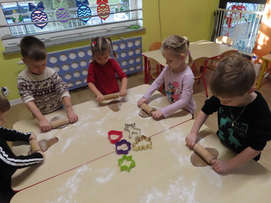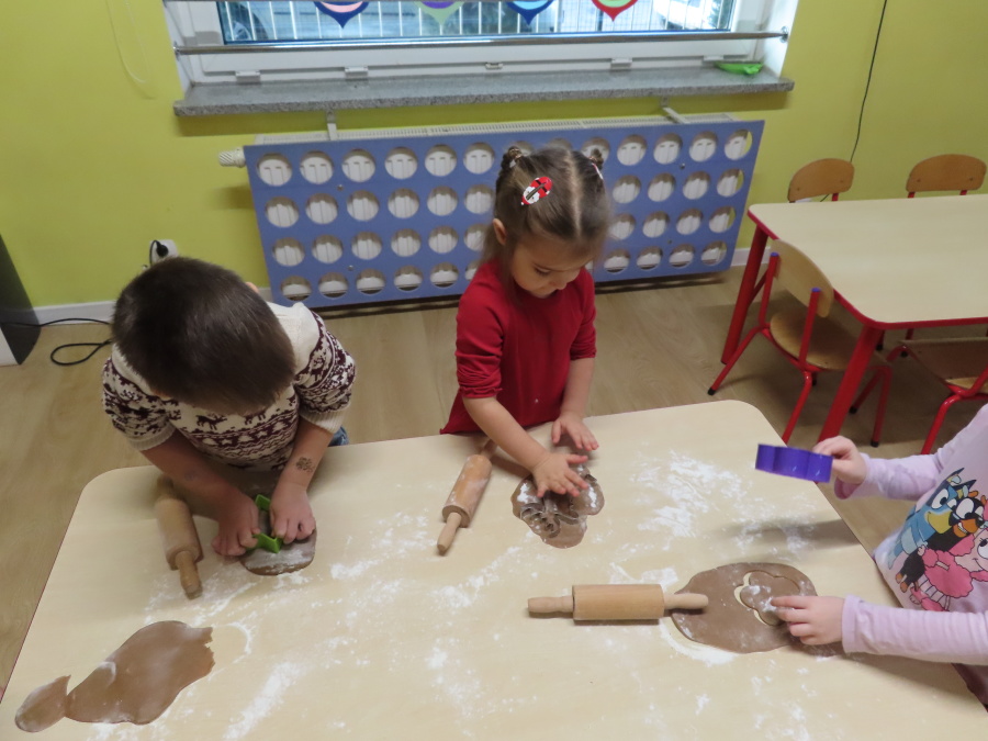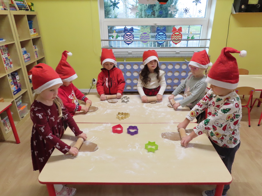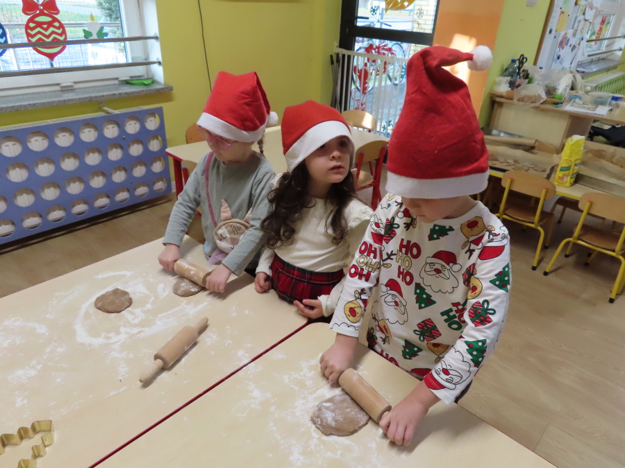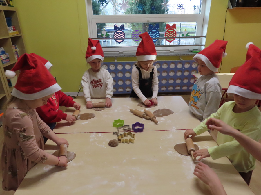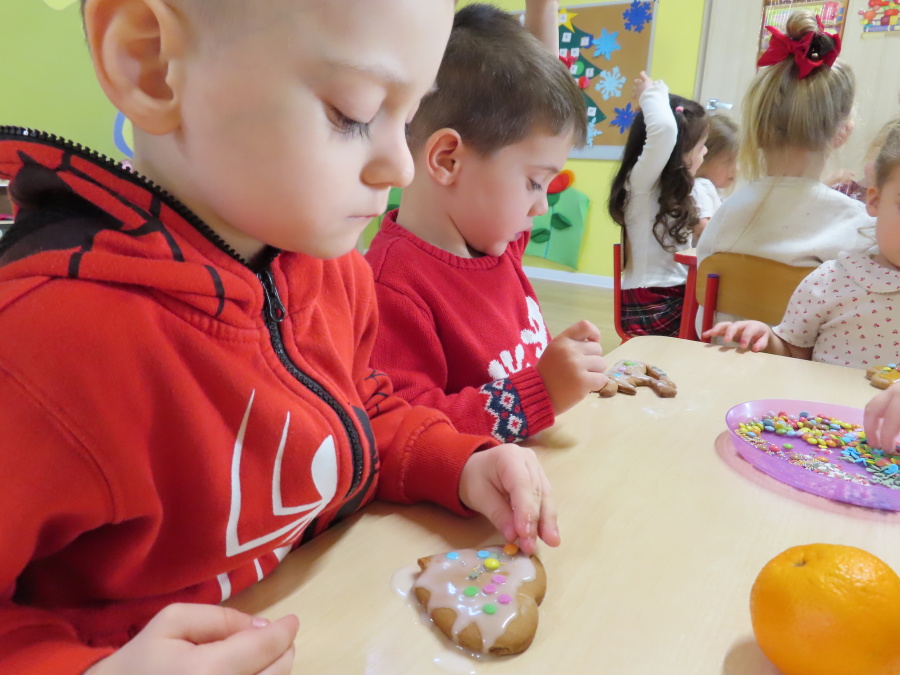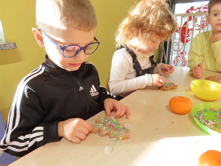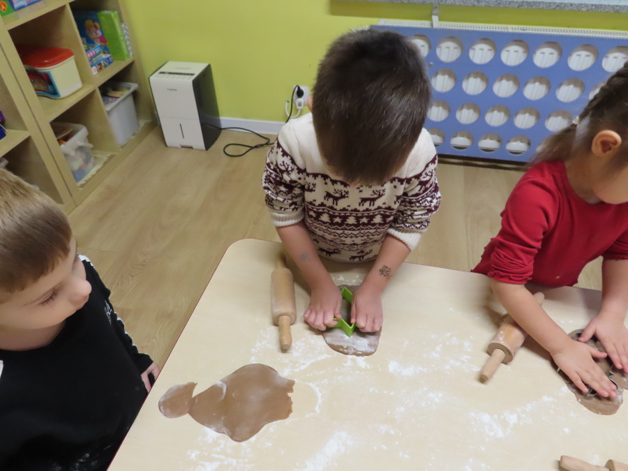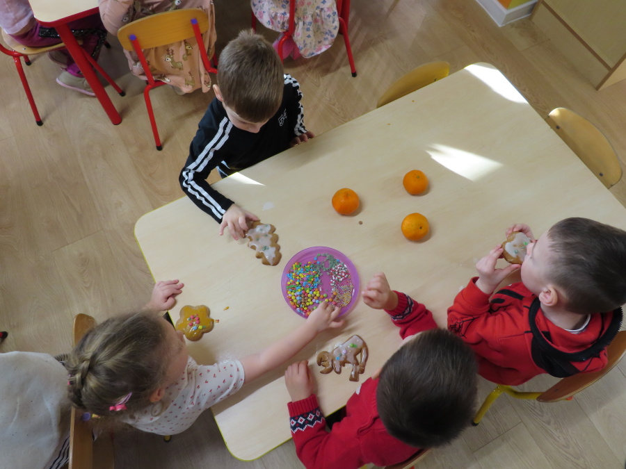 Dziś w naszej grupie rozmawialiśmy o świątecznych tradycjach związanych z wigilijnym stołem. Dzieci dowiedziały się, dlaczego na stole pojawia się 12 potraw, po co wkładamy sianko pod obrus i dlaczego zostawiamy puste nakrycie przy wigilijnym stole. Mówiliśmy też o tradycji pieczenia i ozdabiania pierniczków. Po rozmowie sami zabraliśmy się do pracy. Dzieci wyrabiały ciasto, wycinały świąteczne kształty, a potem oglądały, jak pierniczki się pieką. Gdy ostygły, każdy mógł je pięknie ozdobić kolorowym lukrem i posypkami. Na końcu wszyscy z radością zjedli swoje pyszne pierniczki.