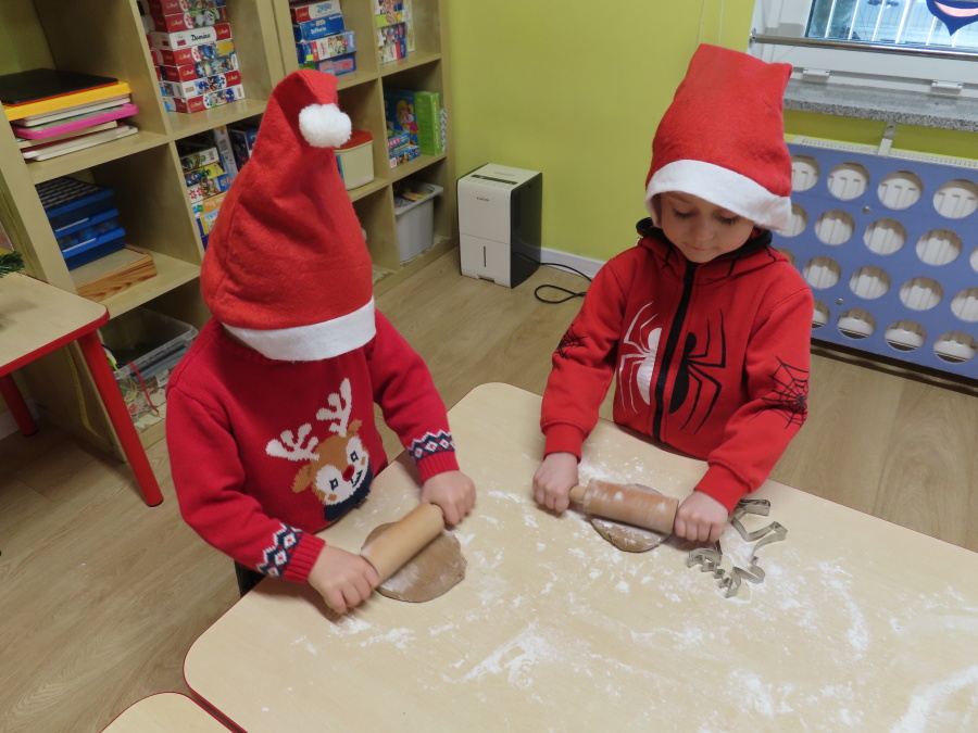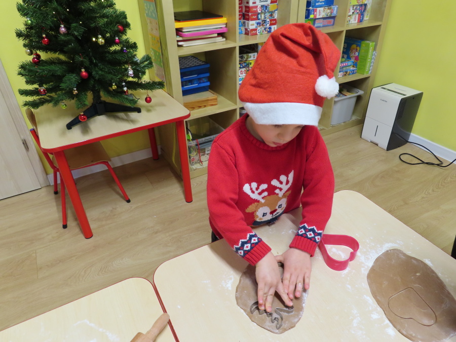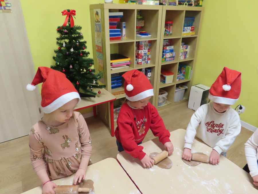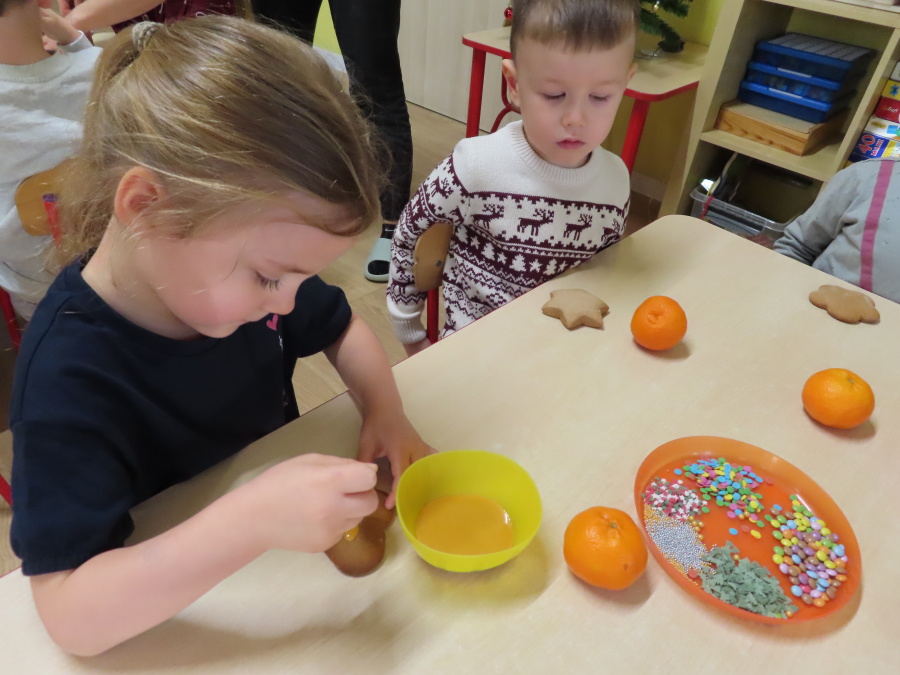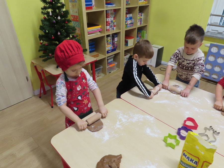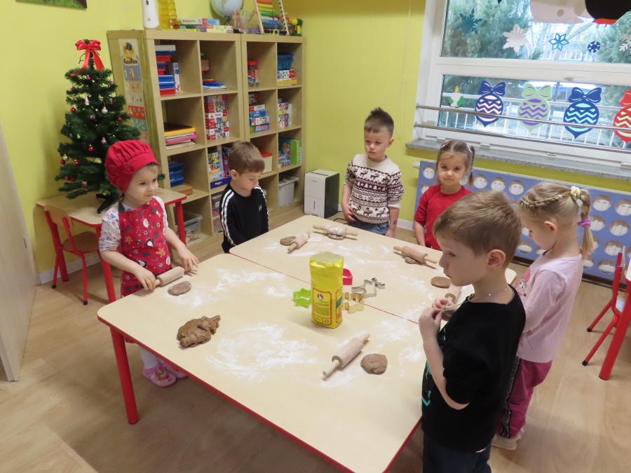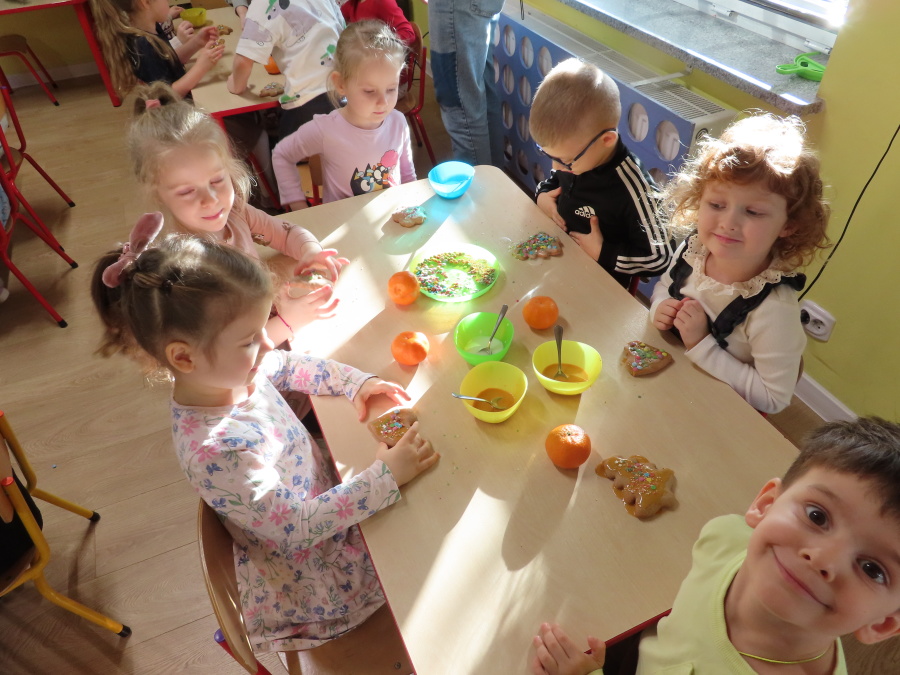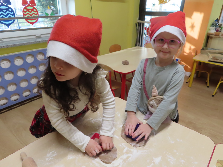 Dziś w naszej grupie rozmawialiśmy o świątecznych tradycjach związanych z wigilijnym stołem. Dzieci dowiedziały się, dlaczego na stole pojawia się 12 potraw, po co wkładamy sianko pod obrus i dlaczego zostawiamy puste nakrycie przy wigilijnym stole. Mówiliśmy też o tradycji pieczenia i ozdabiania pierniczków. Po rozmowie sami zabraliśmy się do pracy. Dzieci wyrabiały ciasto, wycinały świąteczne kształty, a potem oglądały, jak pierniczki się pieką. Gdy ostygły, każdy mógł je pięknie ozdobić kolorowym lukrem i posypkami. Na końcu wszyscy z radością zjedli swoje pyszne pierniczki.