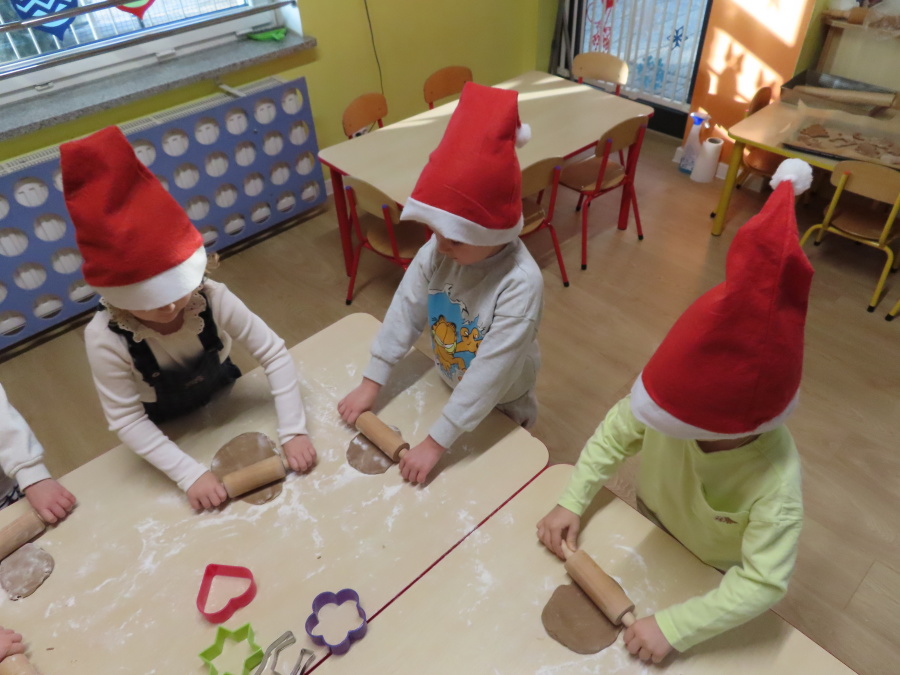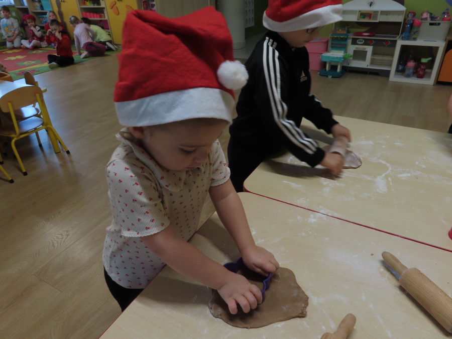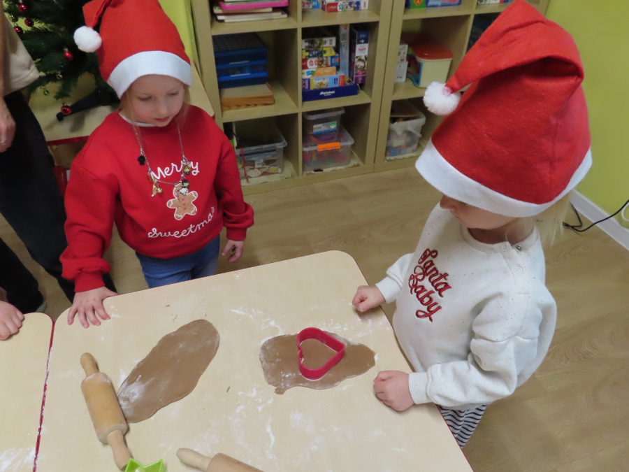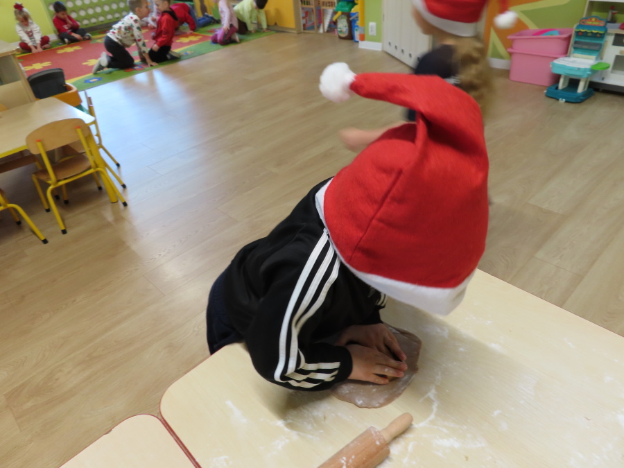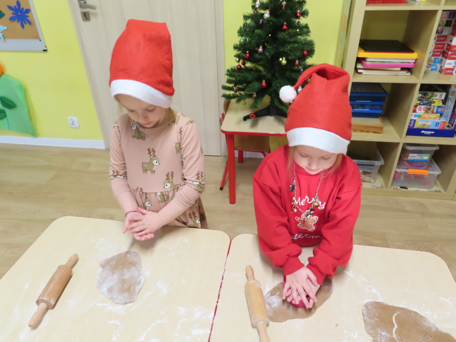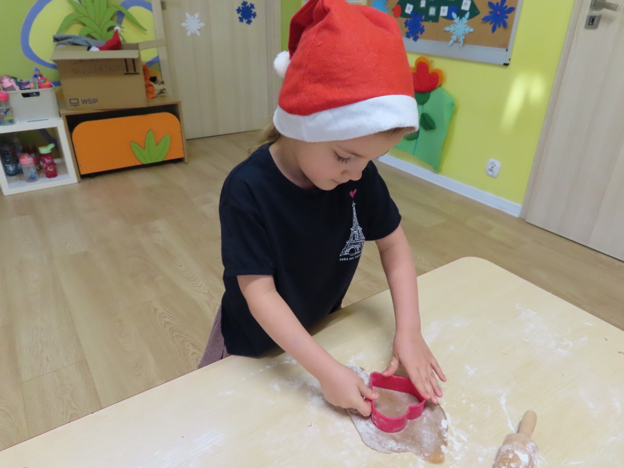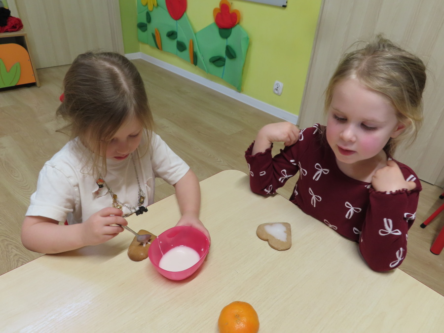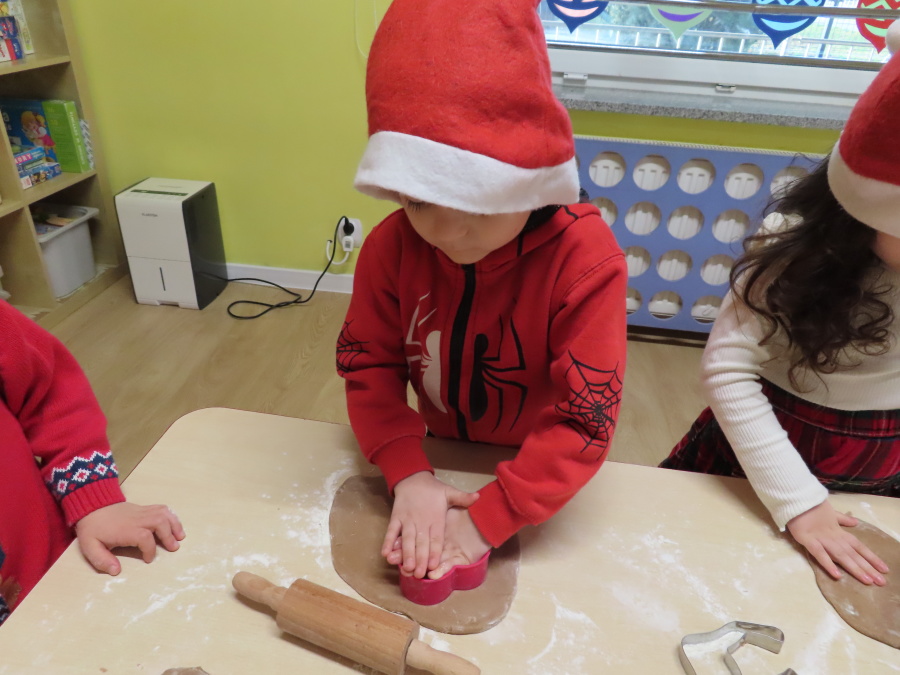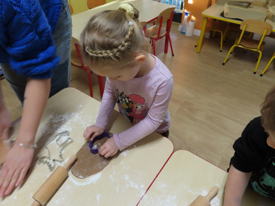 Dziś w naszej grupie rozmawialiśmy o świątecznych tradycjach związanych z wigilijnym stołem. Dzieci dowiedziały się, dlaczego na stole pojawia się 12 potraw, po co wkładamy sianko pod obrus i dlaczego zostawiamy puste nakrycie przy wigilijnym stole. Mówiliśmy też o tradycji pieczenia i ozdabiania pierniczków. Po rozmowie sami zabraliśmy się do pracy. Dzieci wyrabiały ciasto, wycinały świąteczne kształty, a potem oglądały, jak pierniczki się pieką. Gdy ostygły, każdy mógł je pięknie ozdobić kolorowym lukrem i posypkami. Na końcu wszyscy z radością zjedli swoje pyszne pierniczki.