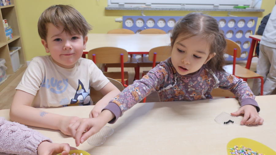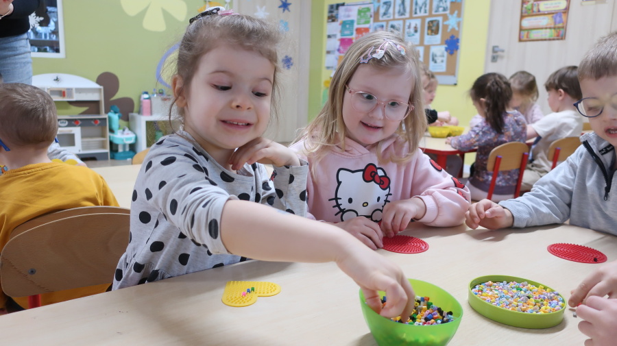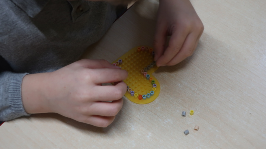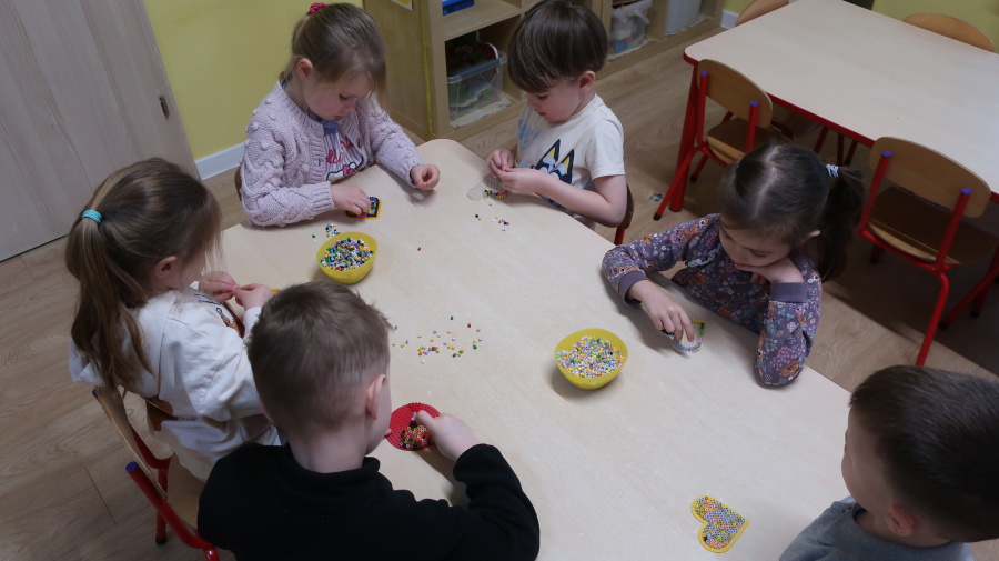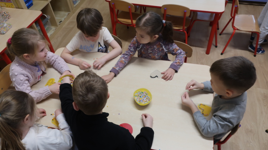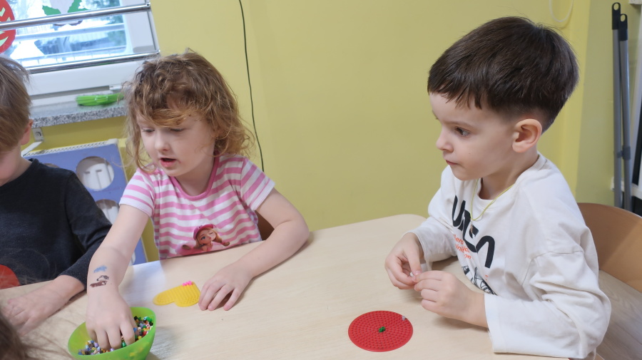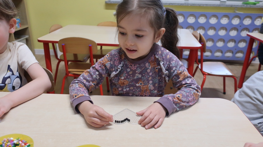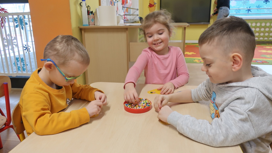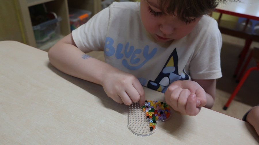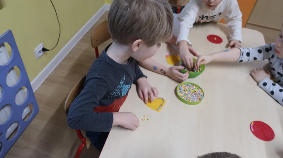 Sensoryka w grupie Tygrysków Podczas dzisiejszych zajęć sensorycznych dzieci układały koraliki do prasowania według własnych pomysłów. Aktywność rozwijała sprawność manualną, koordynację wzrokowo-ruchową oraz koncentrację uwagi. Zajęcia sprzyjały także ćwiczeniu cierpliwości i kreatywności dzieci.