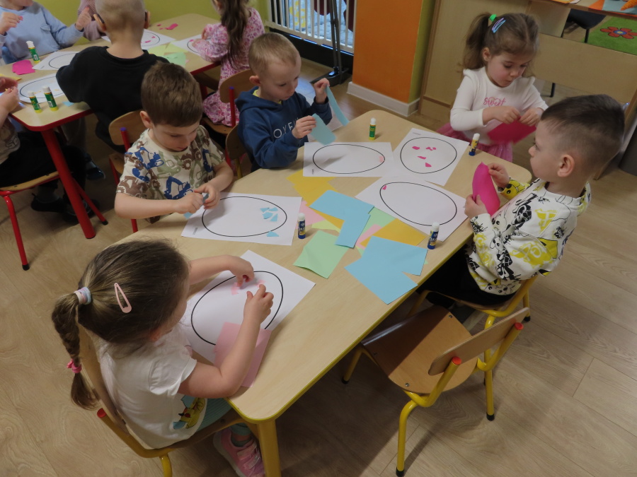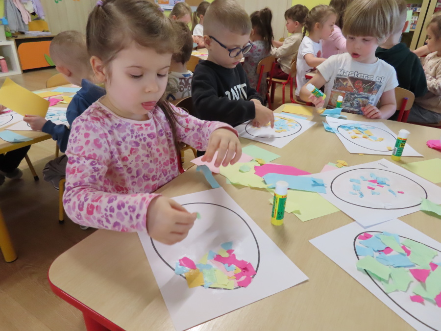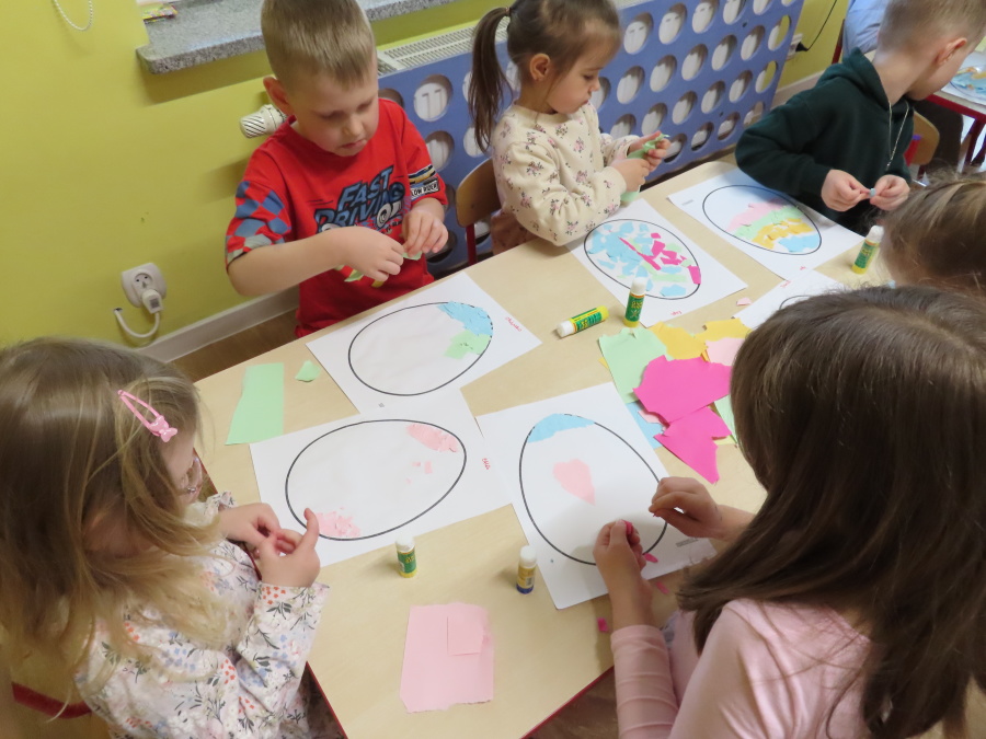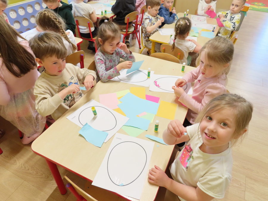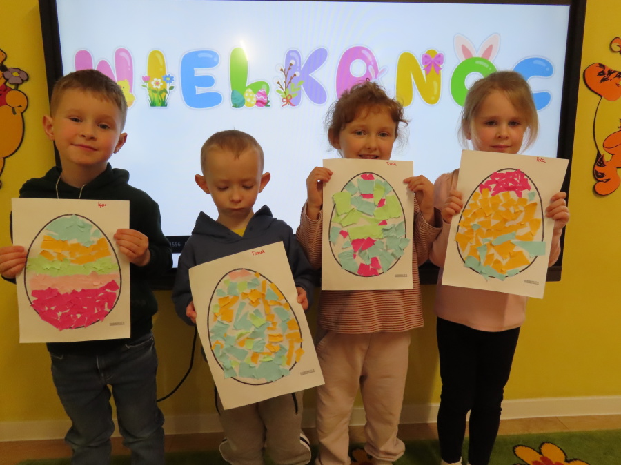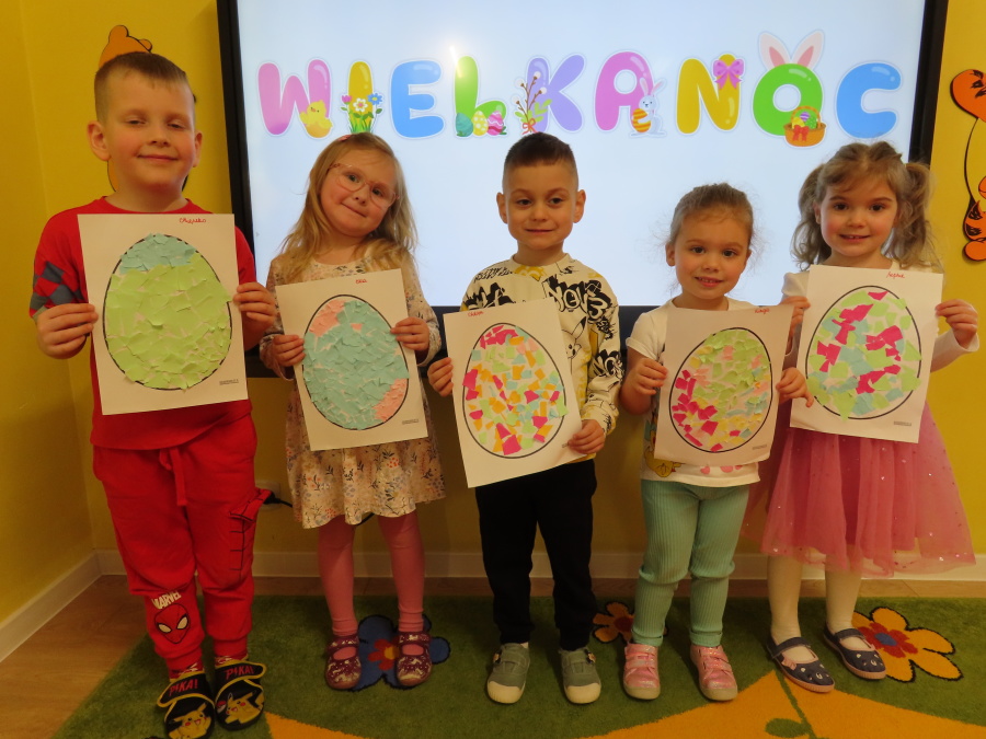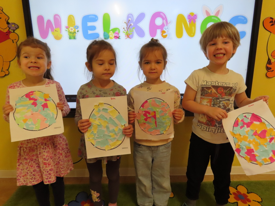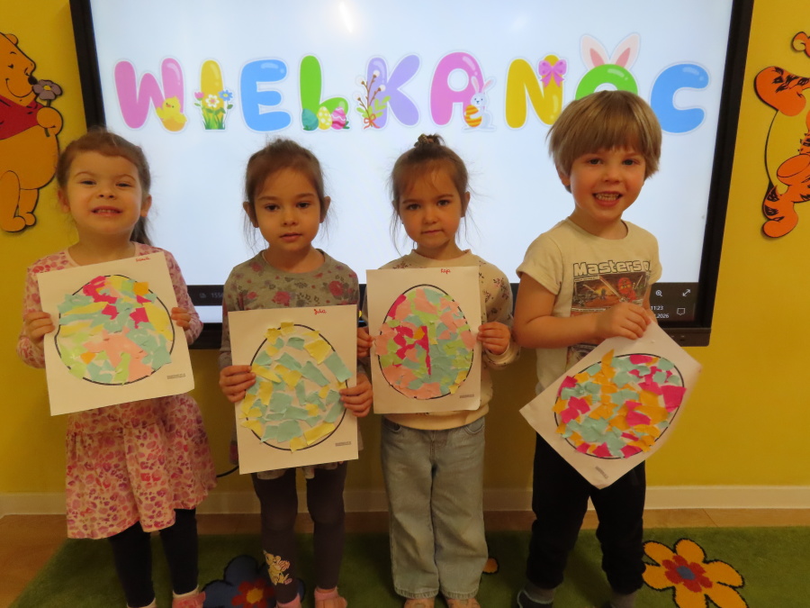 Podczas dzisiejszych zajęć Tygryski zapoznały się z tradycjami wielkanocnymi. Omówiliśmy zwyczaje związane z przygotowaniem palmy wielkanocnej, przygotowaniem i święceniem pokarmów, wykonywaniem pisanek oraz przygotowaniem Wielkanocnych potraw. Dzieci dowiedziały się, jakie produkty wkładamy do koszyczka oraz jakie jest ich symboliczne znaczenie. Zajęcia miały charakter wzbogacający wiedzę o polskich tradycjach. W części praktycznej dzieci wykonały pracę plastyczną – pisanki metodą wydzieranki, rozwijając swoją kreatywność, sprawność manualną oraz estetykę wykonania.