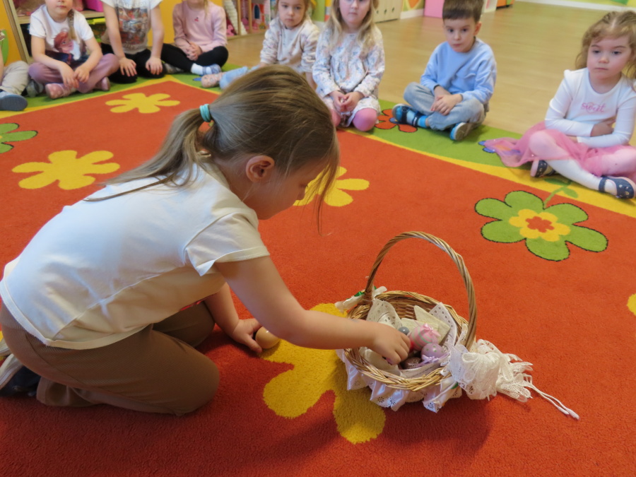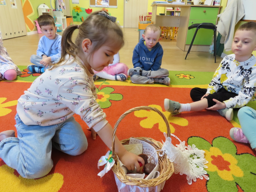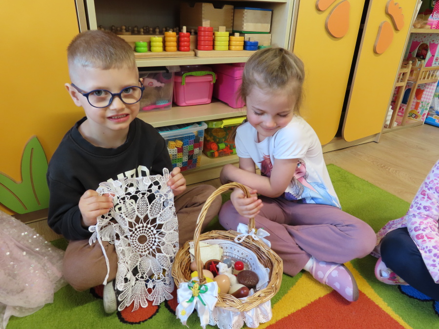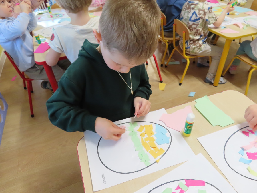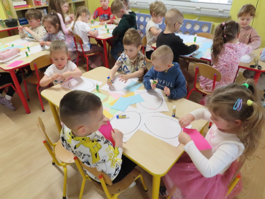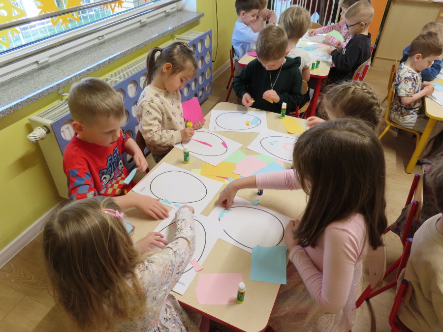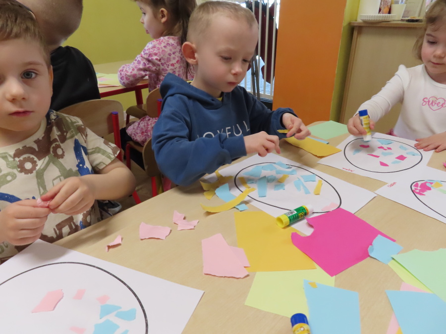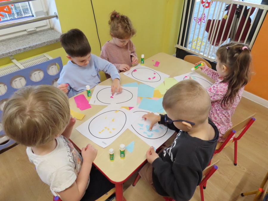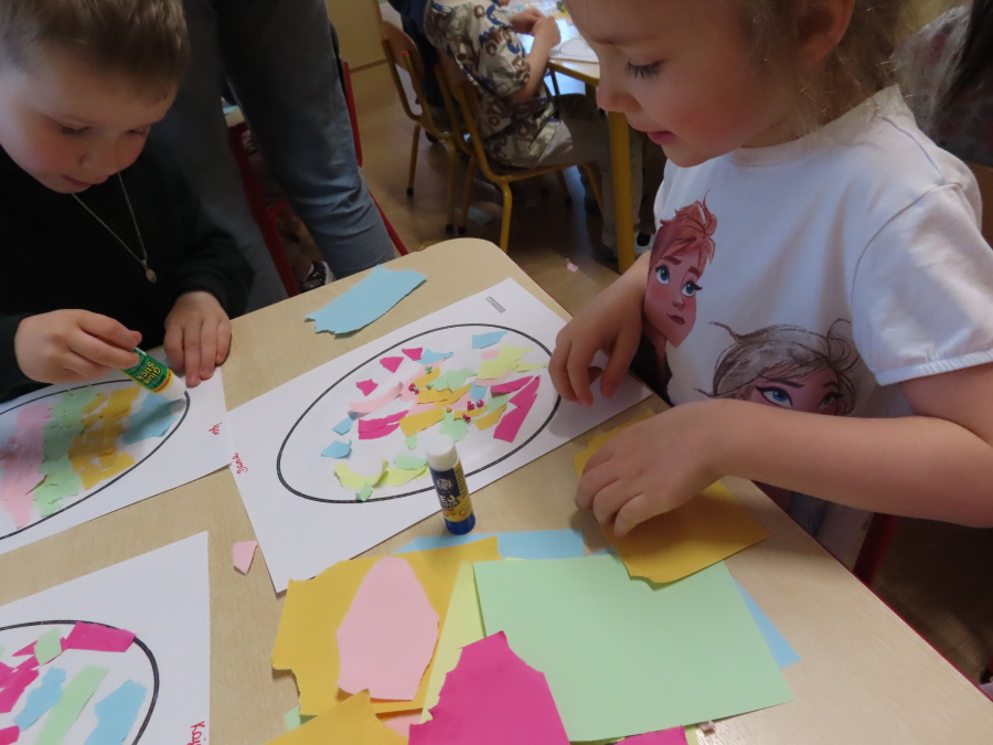 Podczas dzisiejszych zajęć Tygryski zapoznały się z tradycjami wielkanocnymi. Omówiliśmy zwyczaje związane z przygotowaniem palmy wielkanocnej, przygotowaniem i święceniem pokarmów, wykonywaniem pisanek oraz przygotowaniem Wielkanocnych potraw. Dzieci dowiedziały się, jakie produkty wkładamy do koszyczka oraz jakie jest ich symboliczne znaczenie. Zajęcia miały charakter wzbogacający wiedzę o polskich tradycjach. W części praktycznej dzieci wykonały pracę plastyczną – pisanki metodą wydzieranki, rozwijając swoją kreatywność, sprawność manualną oraz estetykę wykonania.